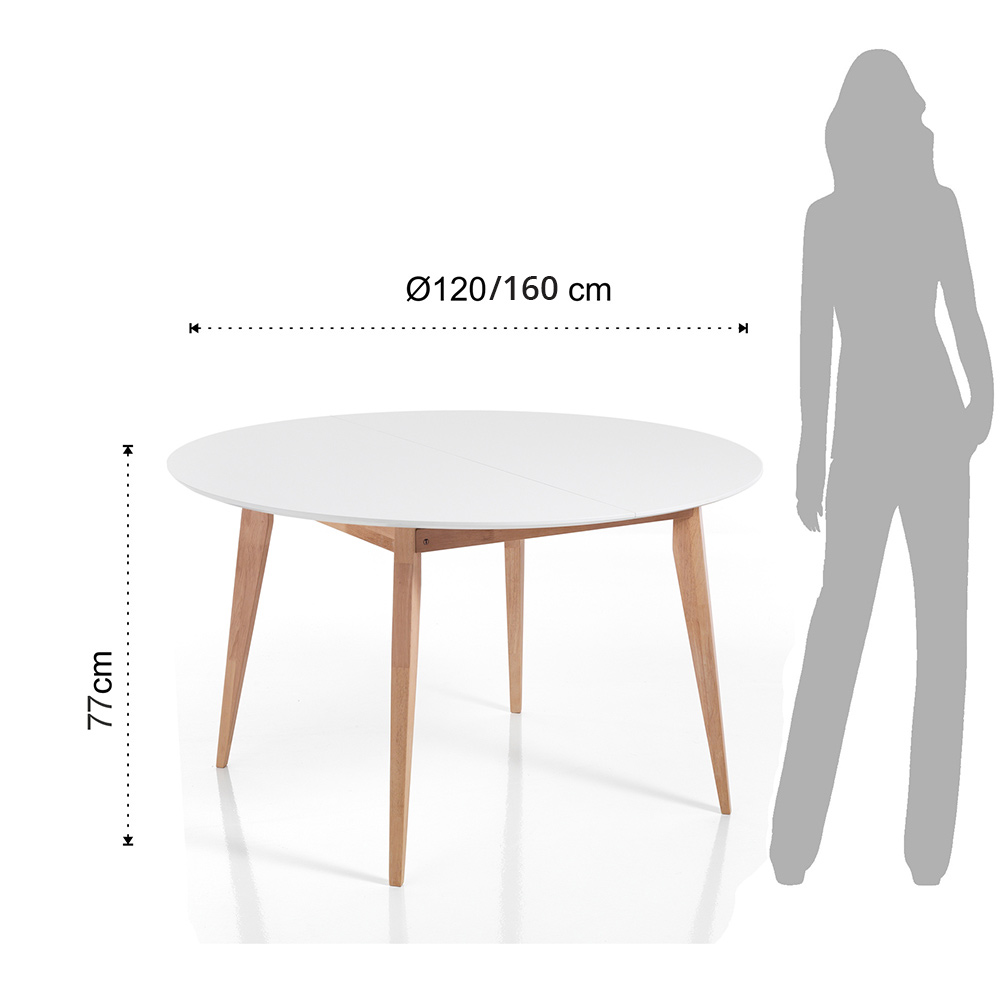 Dining table with round extendable top made of matt white lacquered mdf (thickness 3 cm) and legs in solid wood with bleached oak finish . A product with a simple and clean design, ideal for those who love an essential and versatile style of furniture capable of completing the style of their dining room or kitchen with taste and personality. Its strong point is represented by the extendable top which, thanks to an extension of 40 cm each, reaches a length of 160 cm.