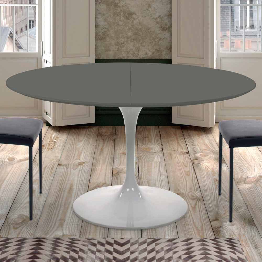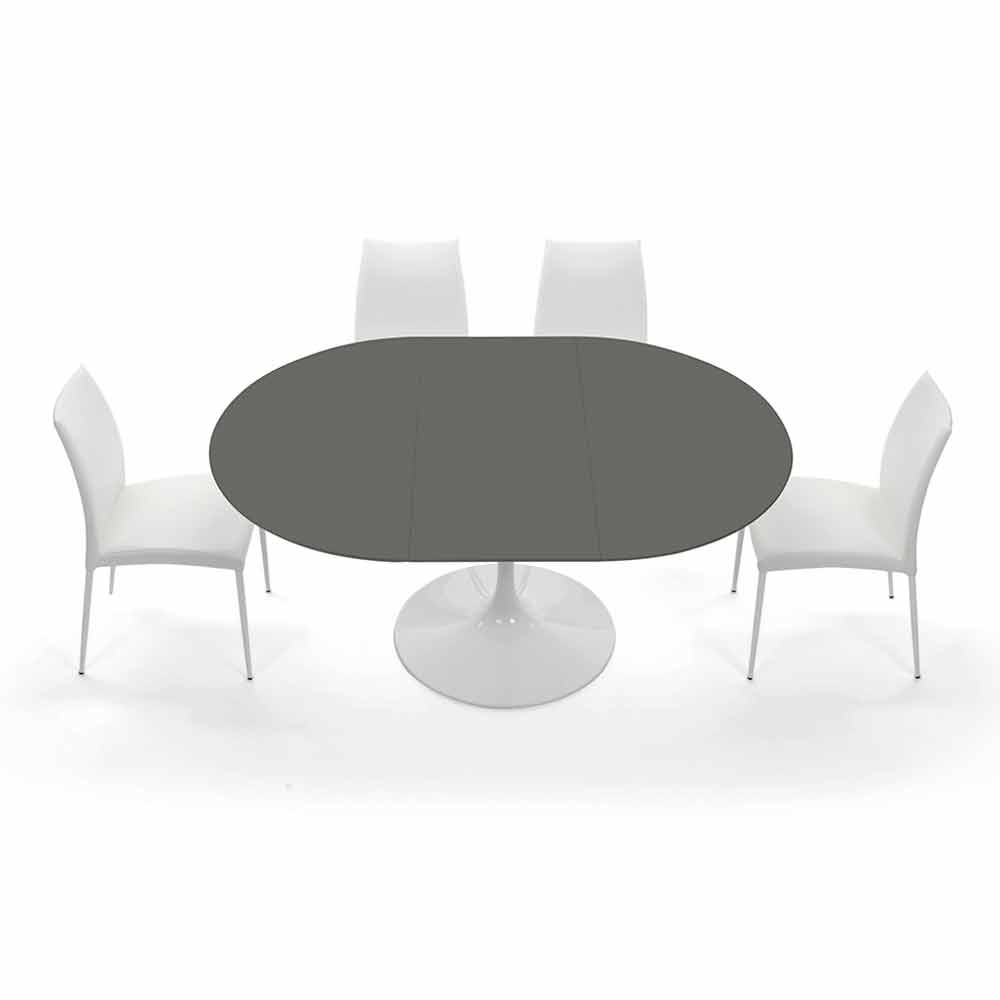 Dining table made in Italy with round extendable top in fenix (thickness 20mm) and base in glossy white lacquered cast aluminum. From the encounter between quality raw materials and an exclusive and revolutionary design, a furnishing accessory with a modern soul is born that manages to complete the style of any environment bringing with it innovation and personality . To increase the functional side is the extendable top which, thanks to an external extension of 50 cm , can reach a length of 170 cm allowing it to accommodate up to 8 people and then return to occupy a smaller space once closed. Its aesthetic is instead characterized by the fenix top which, through the use of innovative resins , offers a resistant surface, pleasant to the touch and extremely opaque , elements that in addition to increasing the functionality of the table underline and complete the design, giving a original and classy touch .