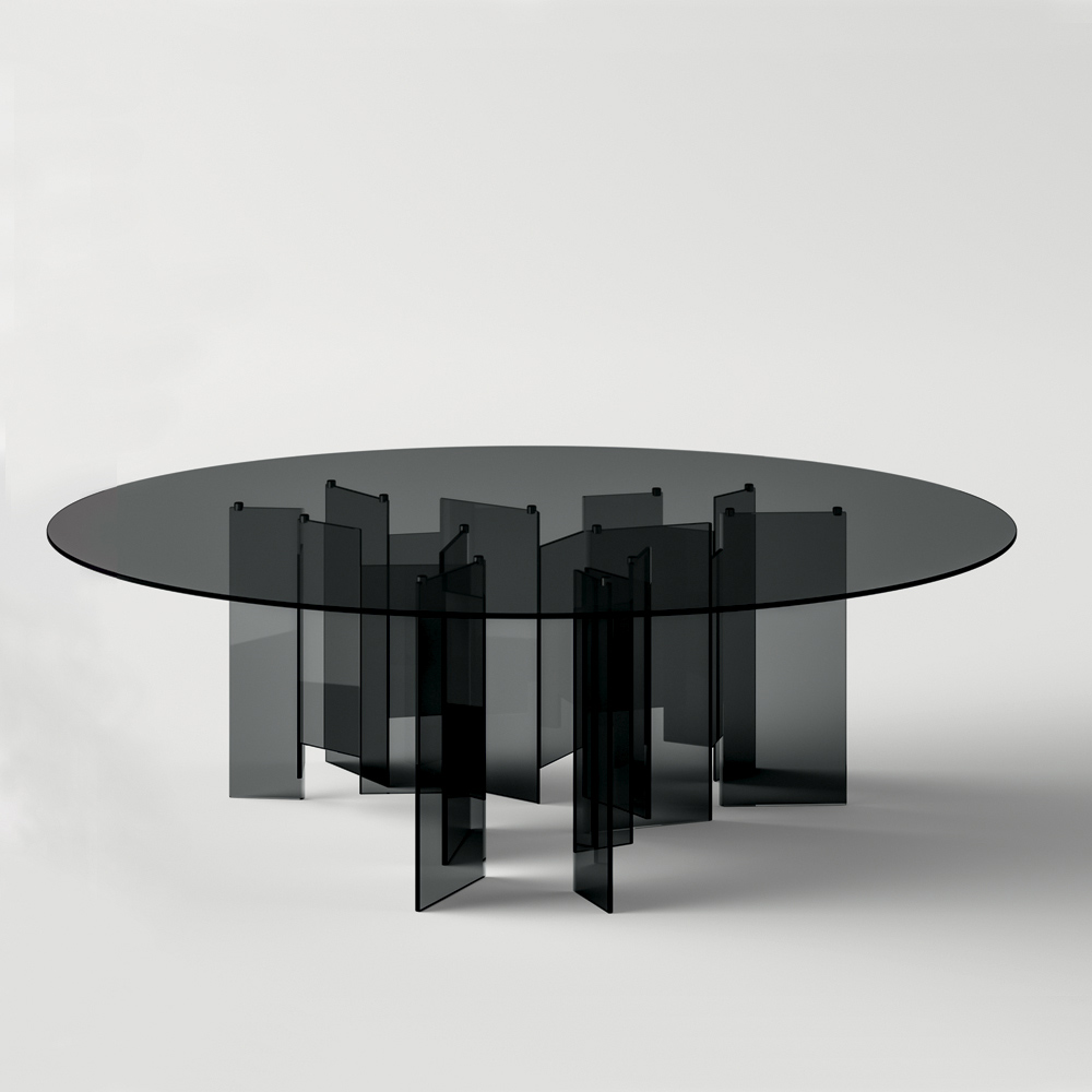 The choice to use a simple material such as glass but at the same time with a strong visual impact characterizes the entire aesthetics of the product making it original , contemporary and elegant , ideal for those looking for a furnishing solution capable of completing the living area of the house with modern and imposing personality . Visually what is striking is undoubtedly the particular shape of the base which is made up of numerous glass plates joined asymmetrically to give the table a sense of dynamism together with an exclusive and refined touch .