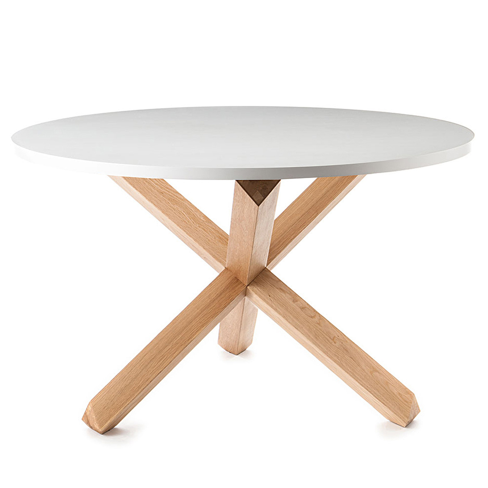Dining table with top made of matt white lacquered mdf (thickness 3 cm) and base in solid wood with bleached oak finish. Characterized by a simple and linear design , this table is enriched by the particular shape of the base which emphasizes its uniqueness and makes it exclusive and original . Its small size makes it perfect for furnishing dining rooms or kitchens with limited spaces with a touch of modernity and style without having to give up furniture full of personality and character .