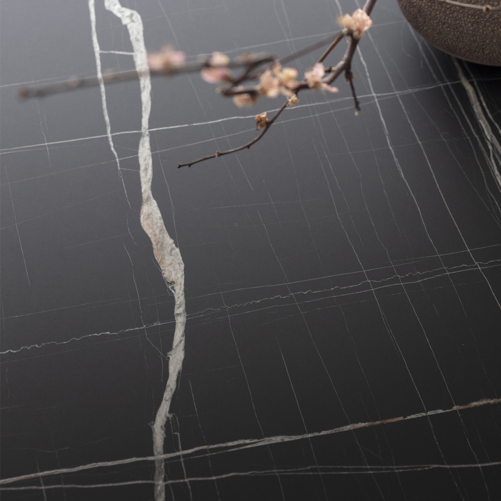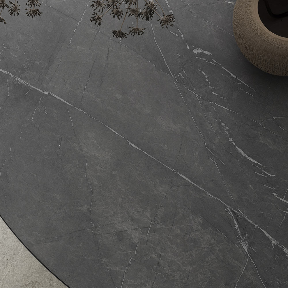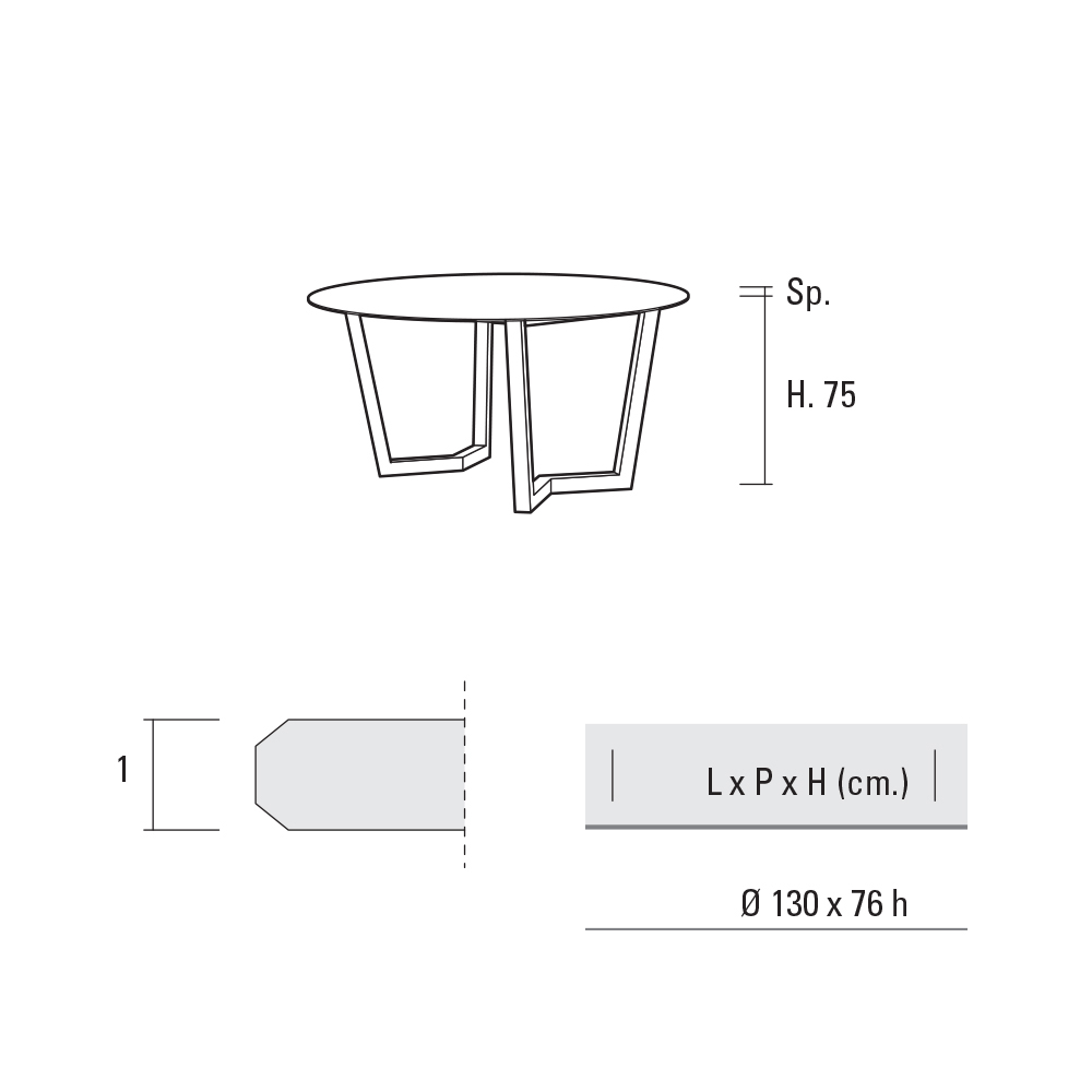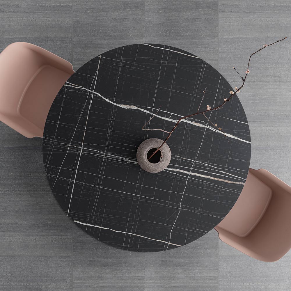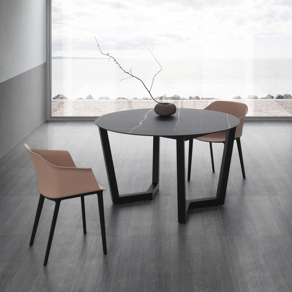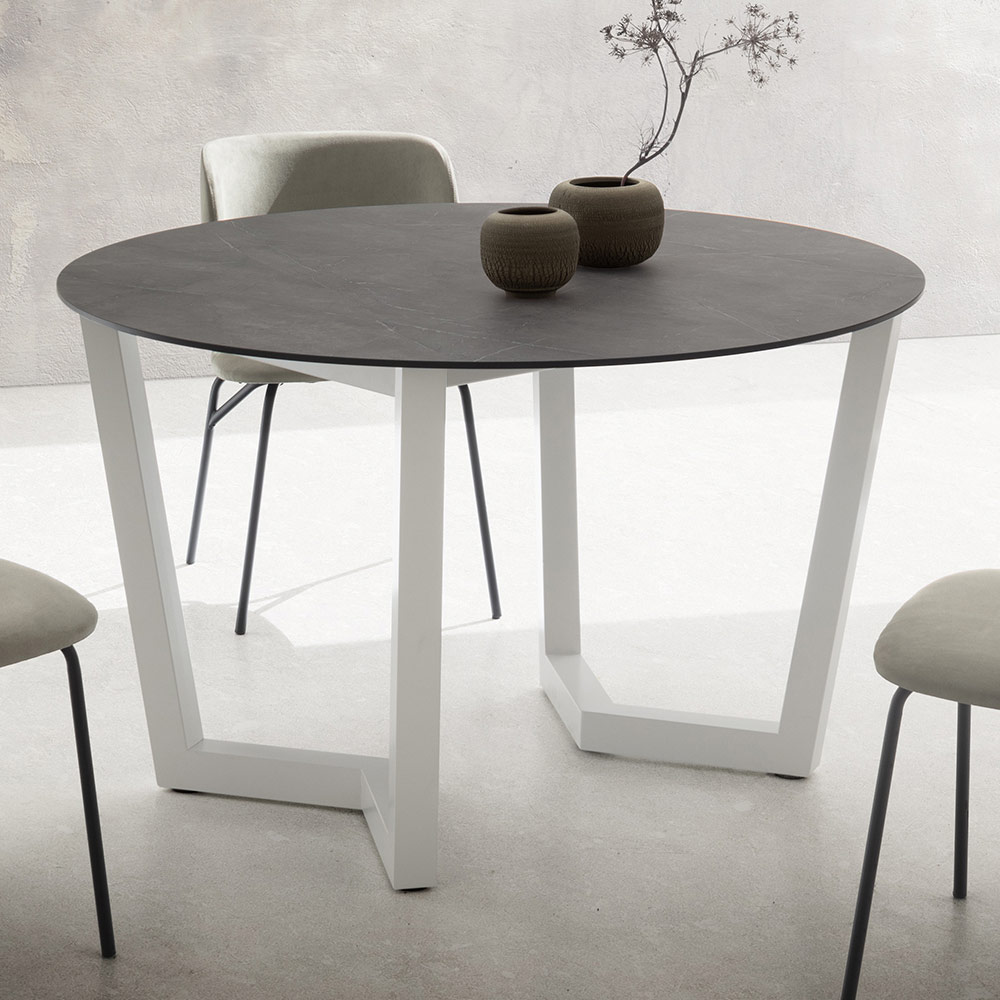 Round kitchen tablemade in Italy with epoxy powder coated metal base and 10 mm thick layered HPL top. A piece of furniture characterized by an elegant and sculptural structure that comes from the combination of materials of different nature together with the passion for workmanship.