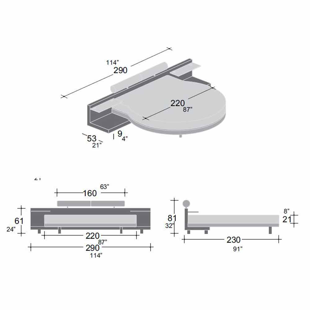 Round double bed with a unique and refined design characterized by the equipped headboard that makes the bed even more practical and functional, including a bench in solid wood and plywood padded with polyurethane foam covered with polyester wadding and / or velvet. Also on the headboard there are two