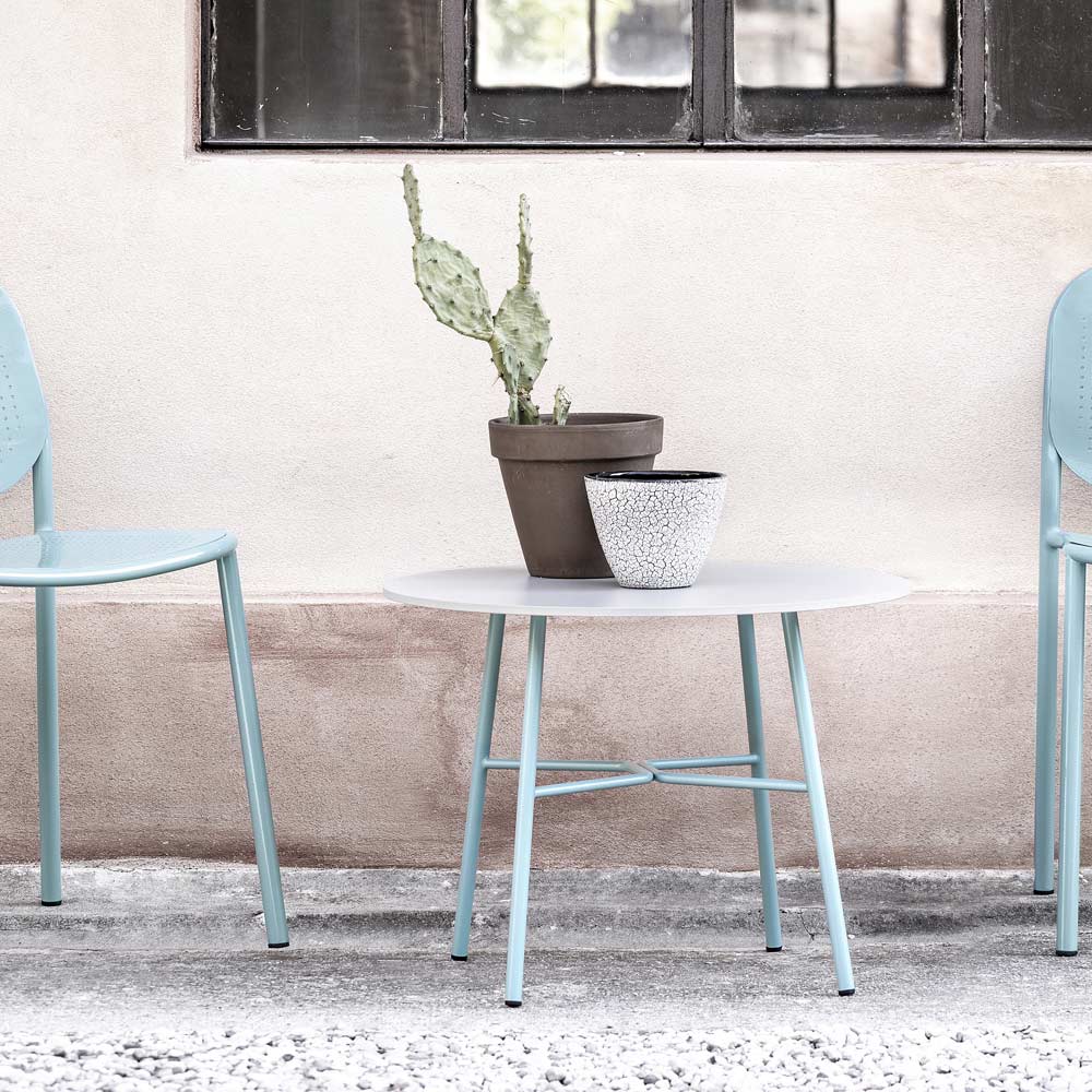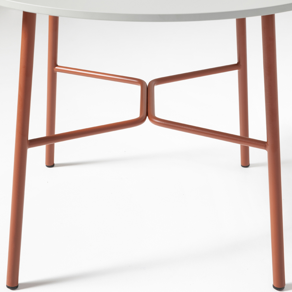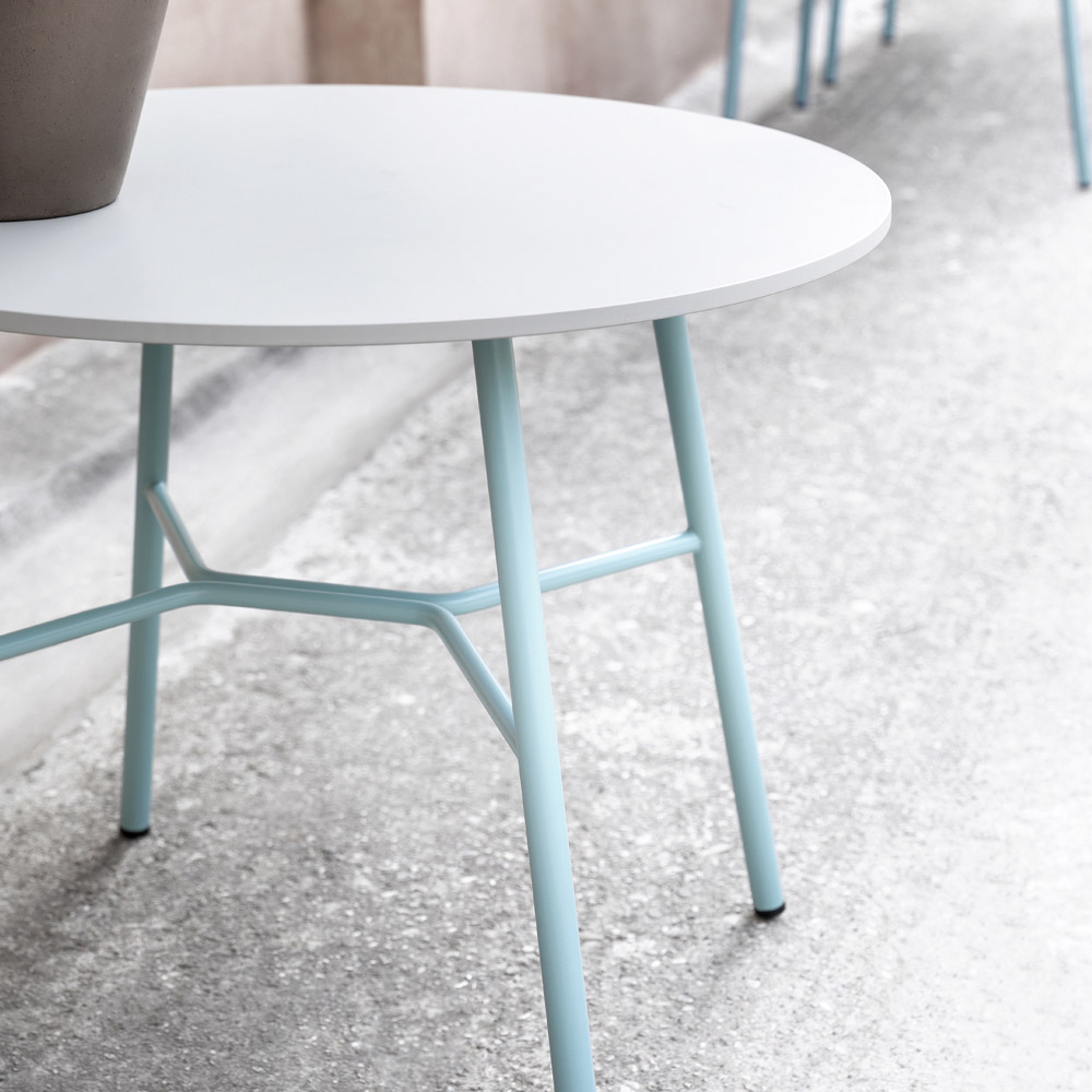 Garden coffee table entirely made in Italy with round hpl top and painted metal structure . An object with an original and versatile design that arises from the need to furnish domestic outdoor areas in an exclusive and refined way but also lounge areas and contract spaces such as hotels, bars and restaurants. A complement that expresses through its simple and minimal shapes all the modernity of innovative materials which, in addition to offering solidity and resistance, create a furnishing solution capable of conquering the center of attention thanks to an eclectic personality and an innovative character. .