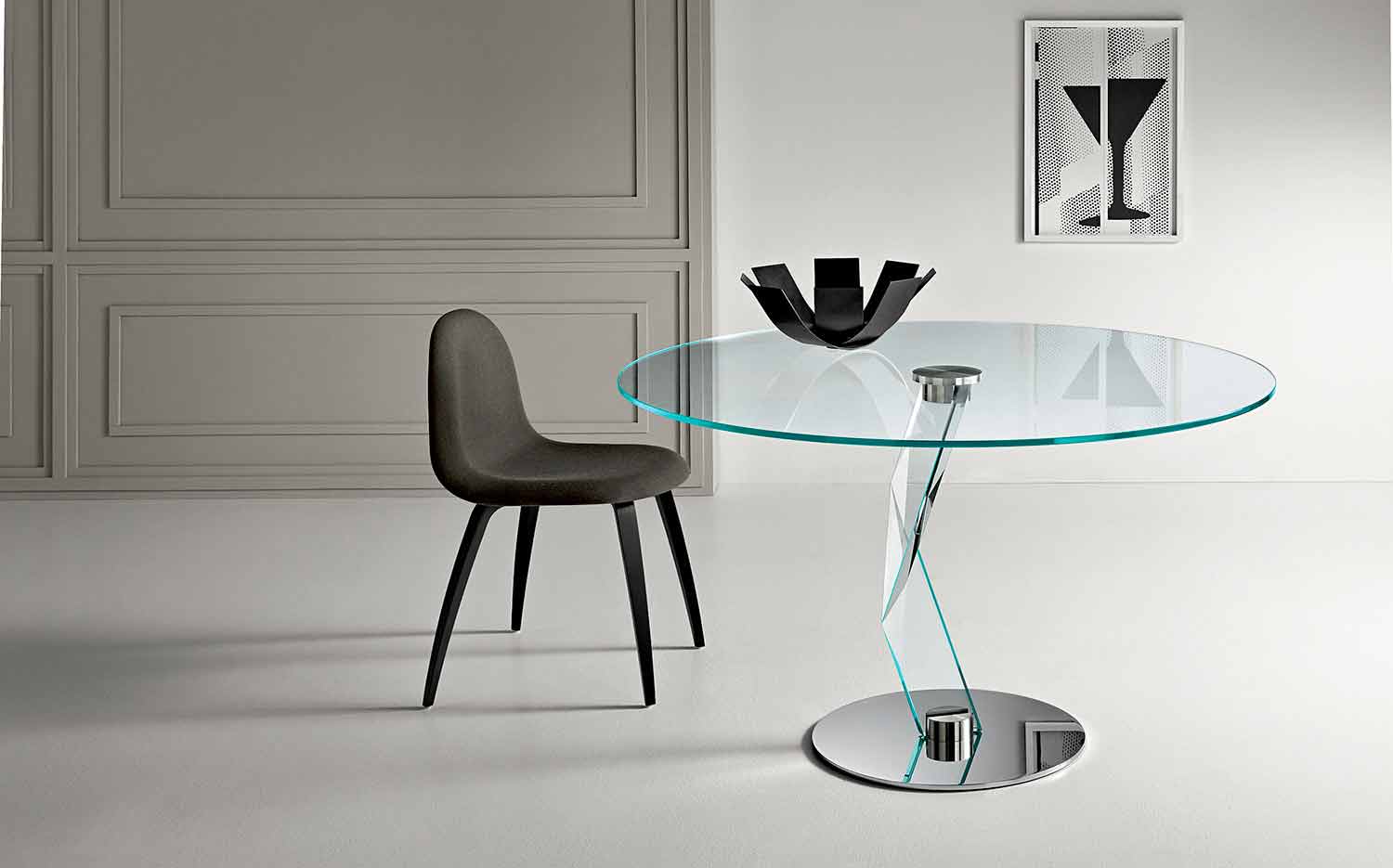 Composed of an extra-clear glass top (12 mm thick) which contrasts with a central leg in extra-clear glass (30 mm thick) resting on a chromed metal base.