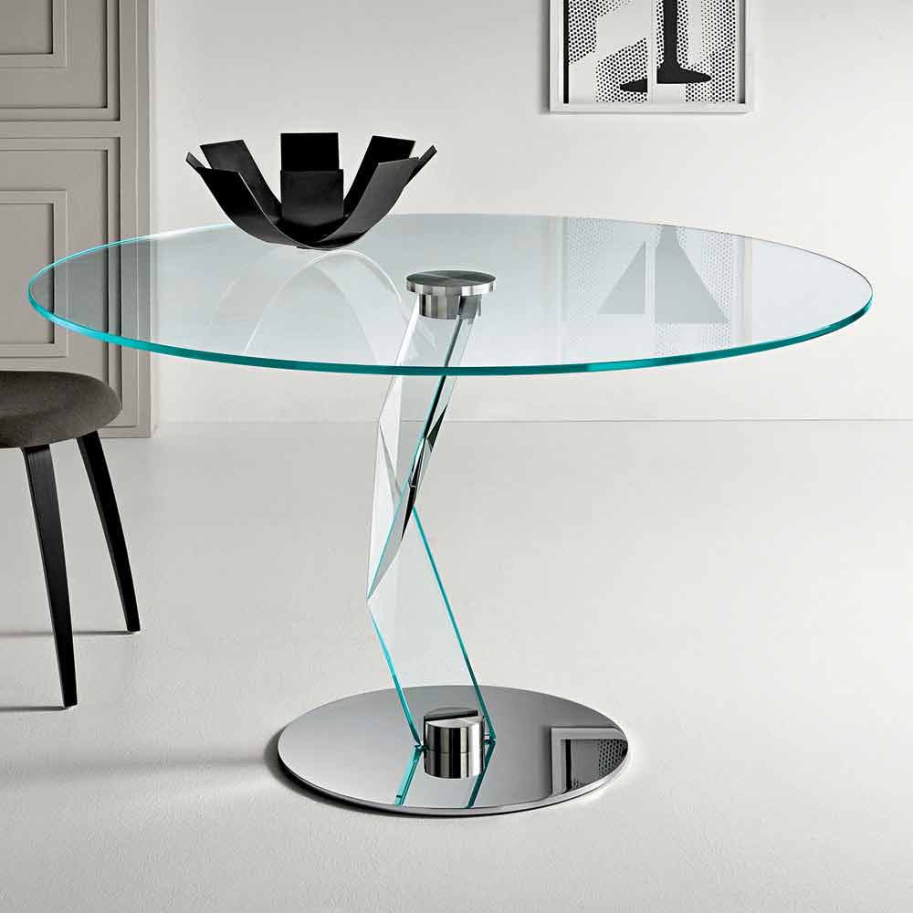 Round kitchen table with extra-clear glass top and extra-clear glass and chromed metal base of modern design, made in Italy.