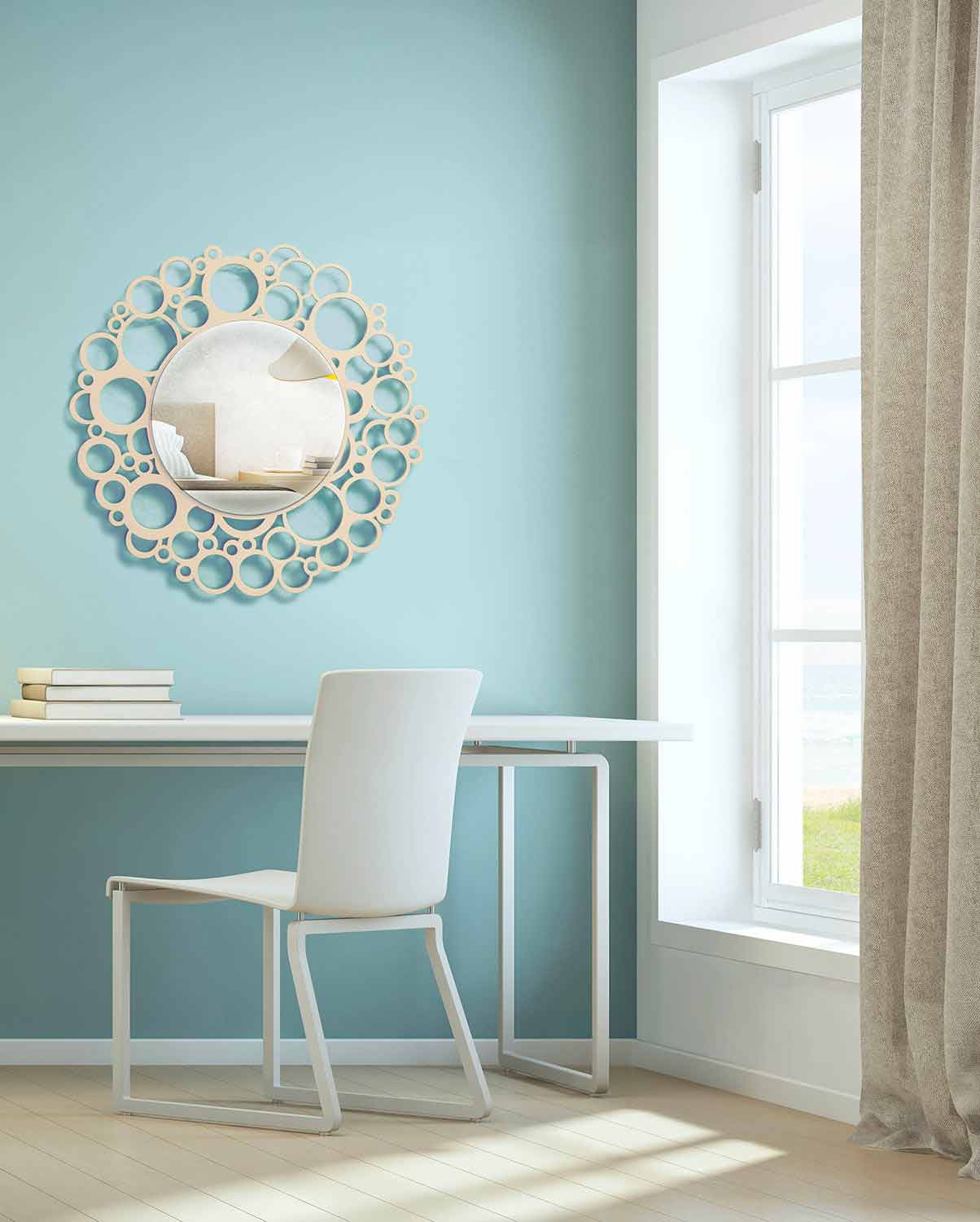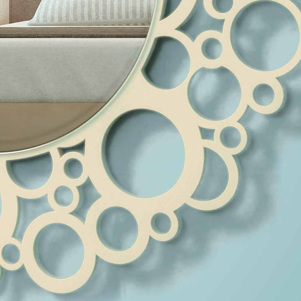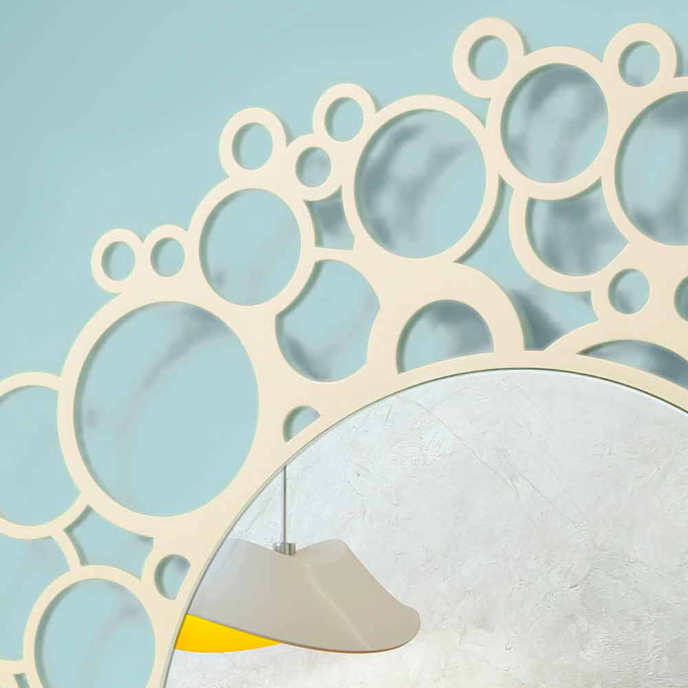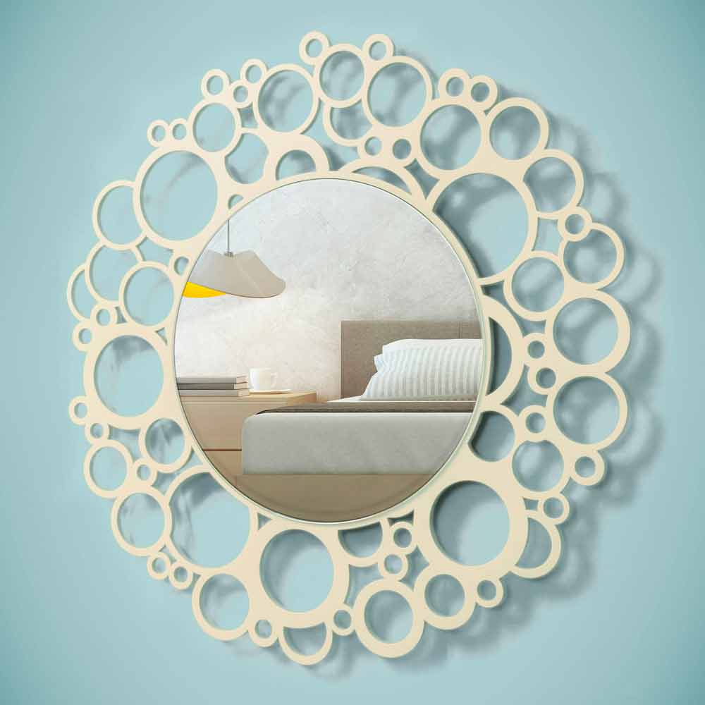 Small round mirror with laser-worked lacquered wood frame. It adapts to modern environments, with a minimal design such as sutdi or working environments.