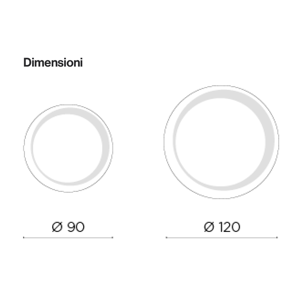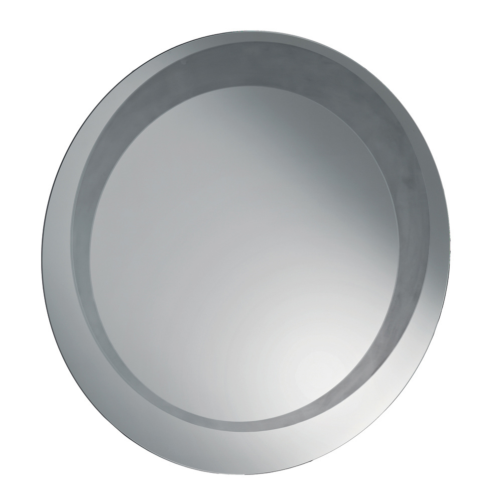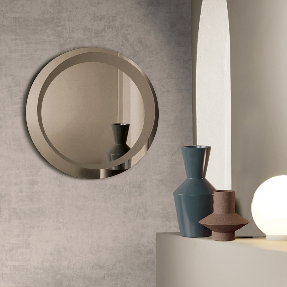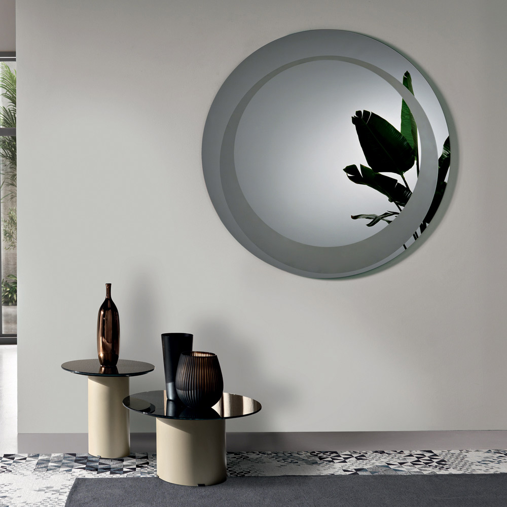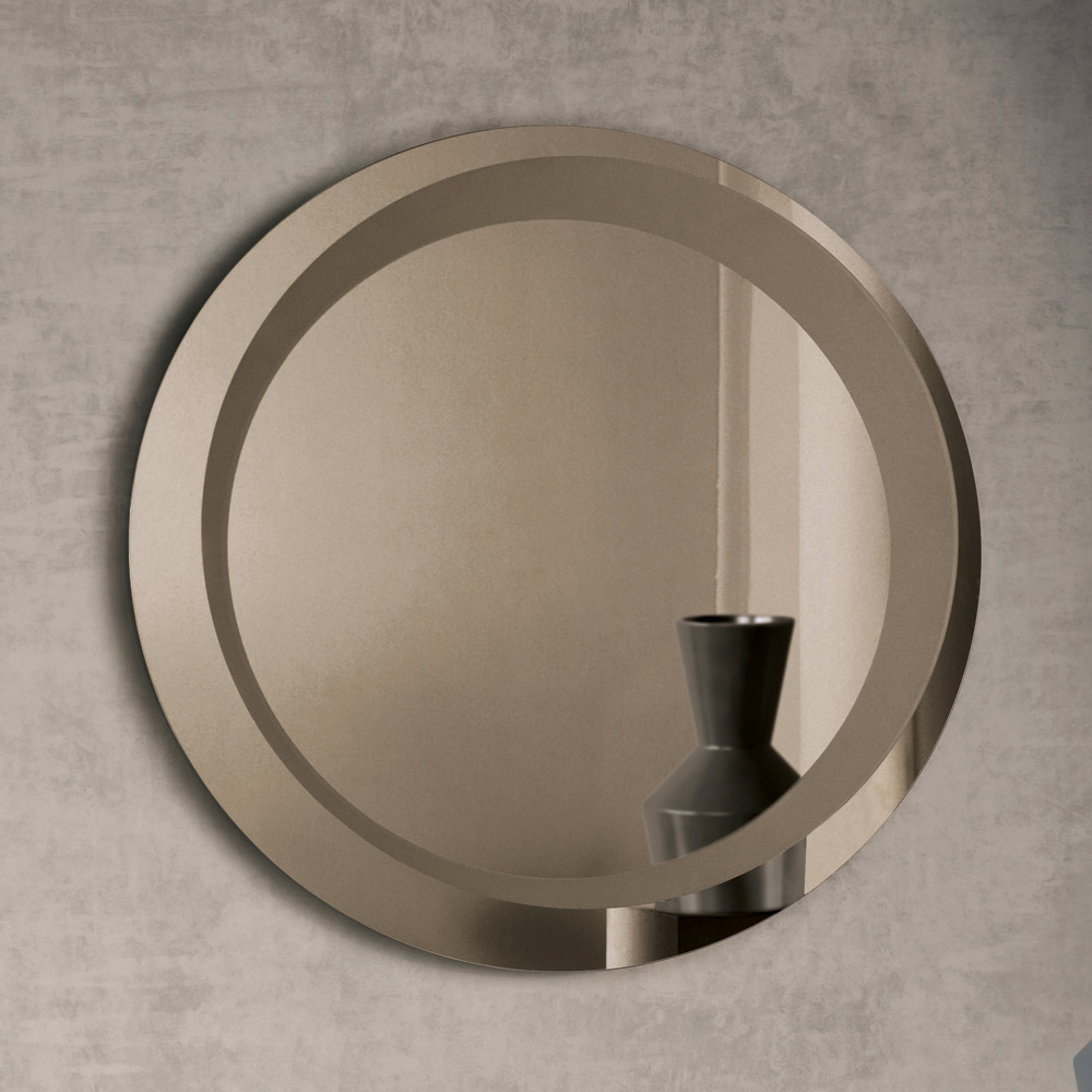 The mirror features a round shape embellished with a tone-on-tone sandblasted decoration that forms an off-center circle of varying thickness . This graphic detail creates a refined interplay of surfaces and reflections, adding depth and personality to the mirror's design.