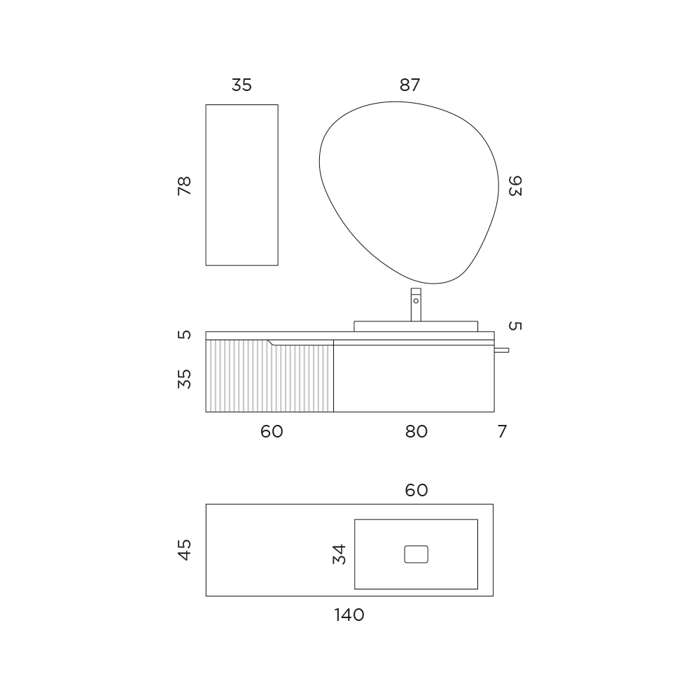 Washbasin: Length 60 cm x Depth 34 cm x Height 15.7 cm