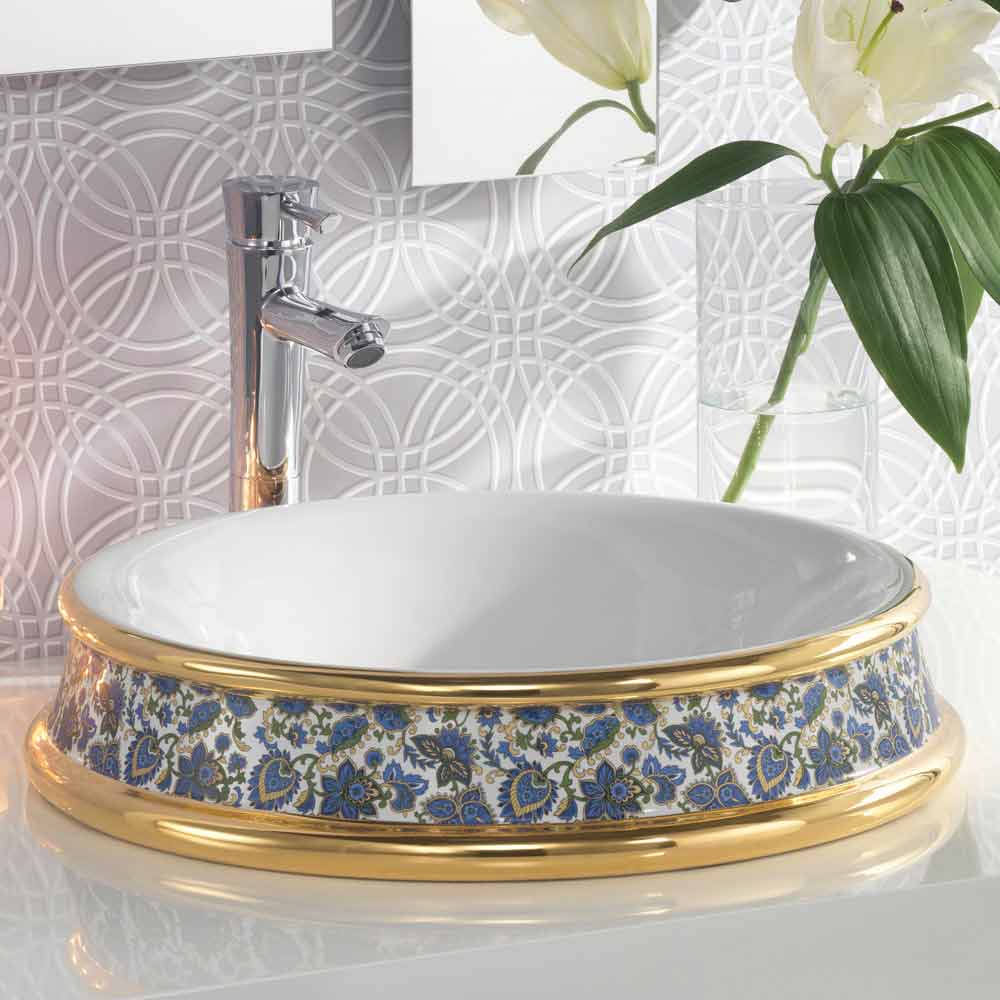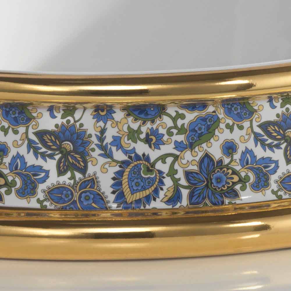 Bathroom semirecessed sink made in Italy in fire clay, handmade, with stripe with a blue and gold floral decoration and rings painted in 24k gold.