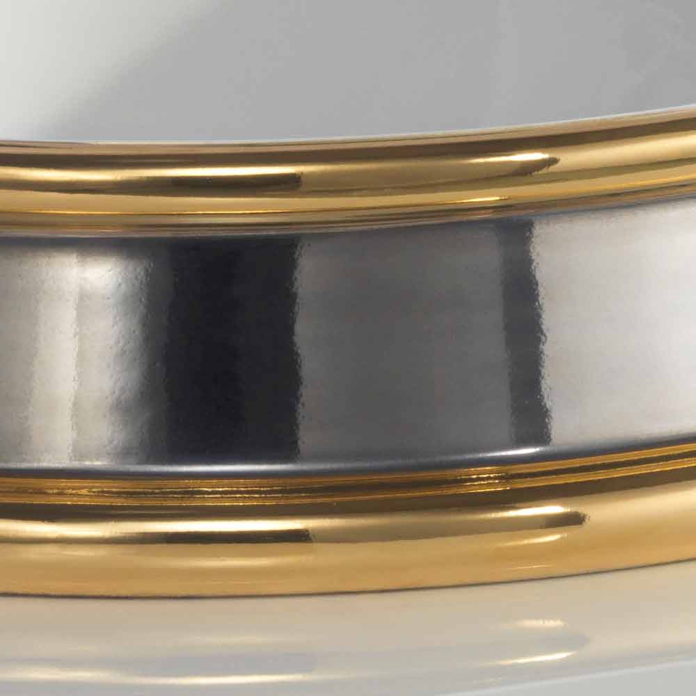 Semirecessed bathroom sink made in Italy in fire clay, hand made, with stripe hand painted in platinum and rings hand painted with 24k golden finish.