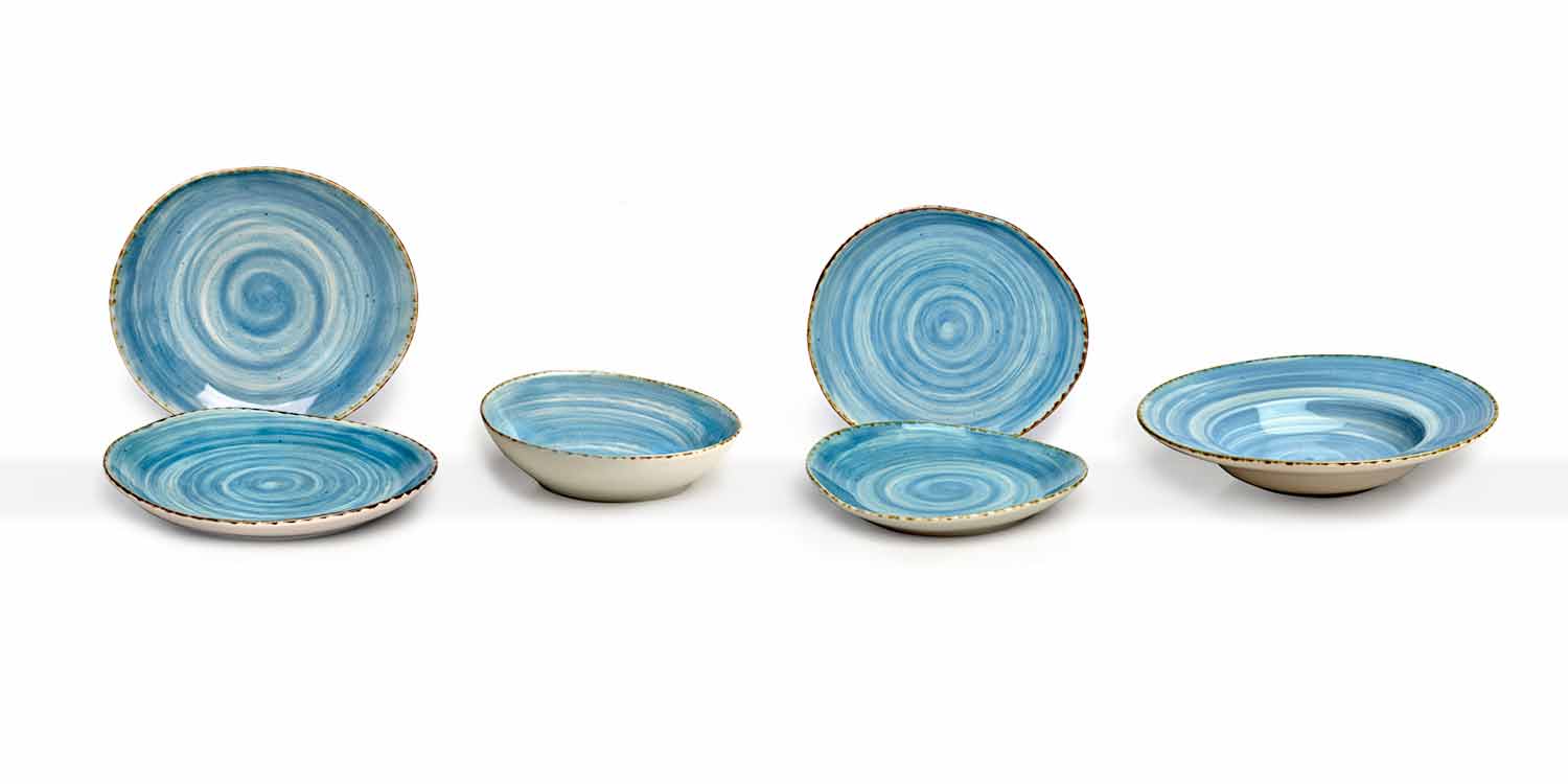 Originality : the irregular shapes, the decorations with imprecise brushstrokes and with a speckled effect finished and painted by hand and the antiqued edge, highlight the rustic and earthy style of the collection. Every difference between one piece and another is to be considered as an additional characteristic of value and personality, making each piece unique.