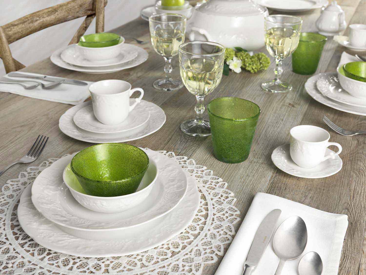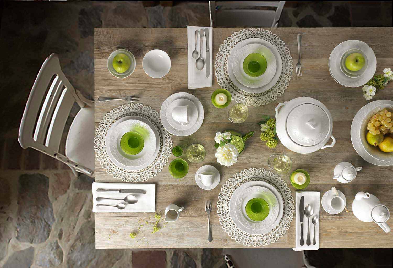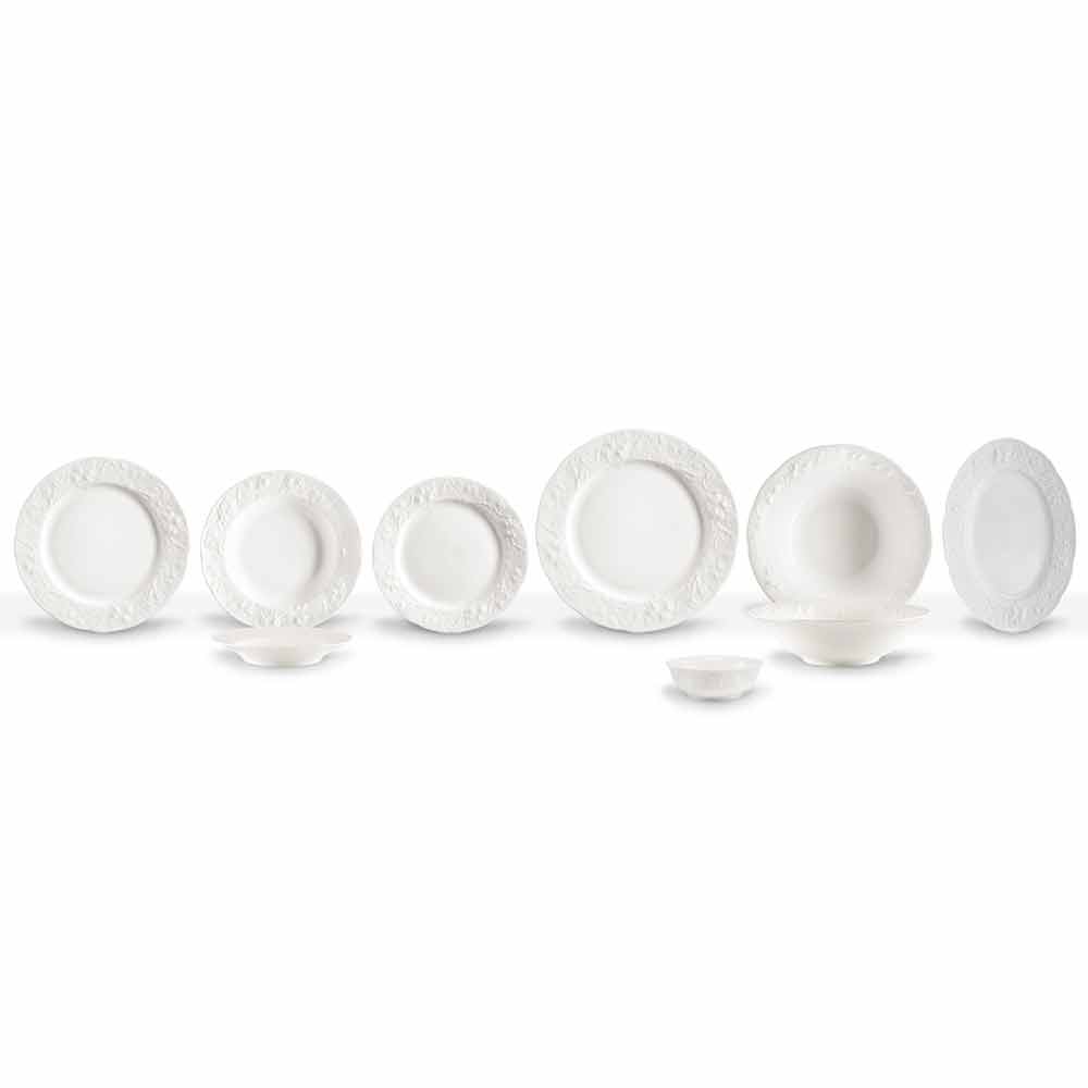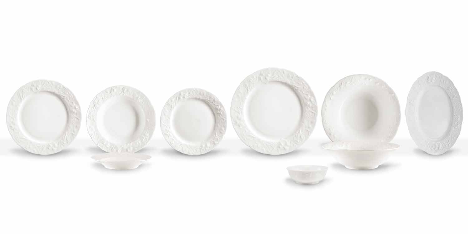 sculptural elegance in relief are the keywords of these creations in bright white porcelain and an artistic relief decoration. On the one hand, an attractive design with multiple shapes, on the other the charming country-inspired decoration.