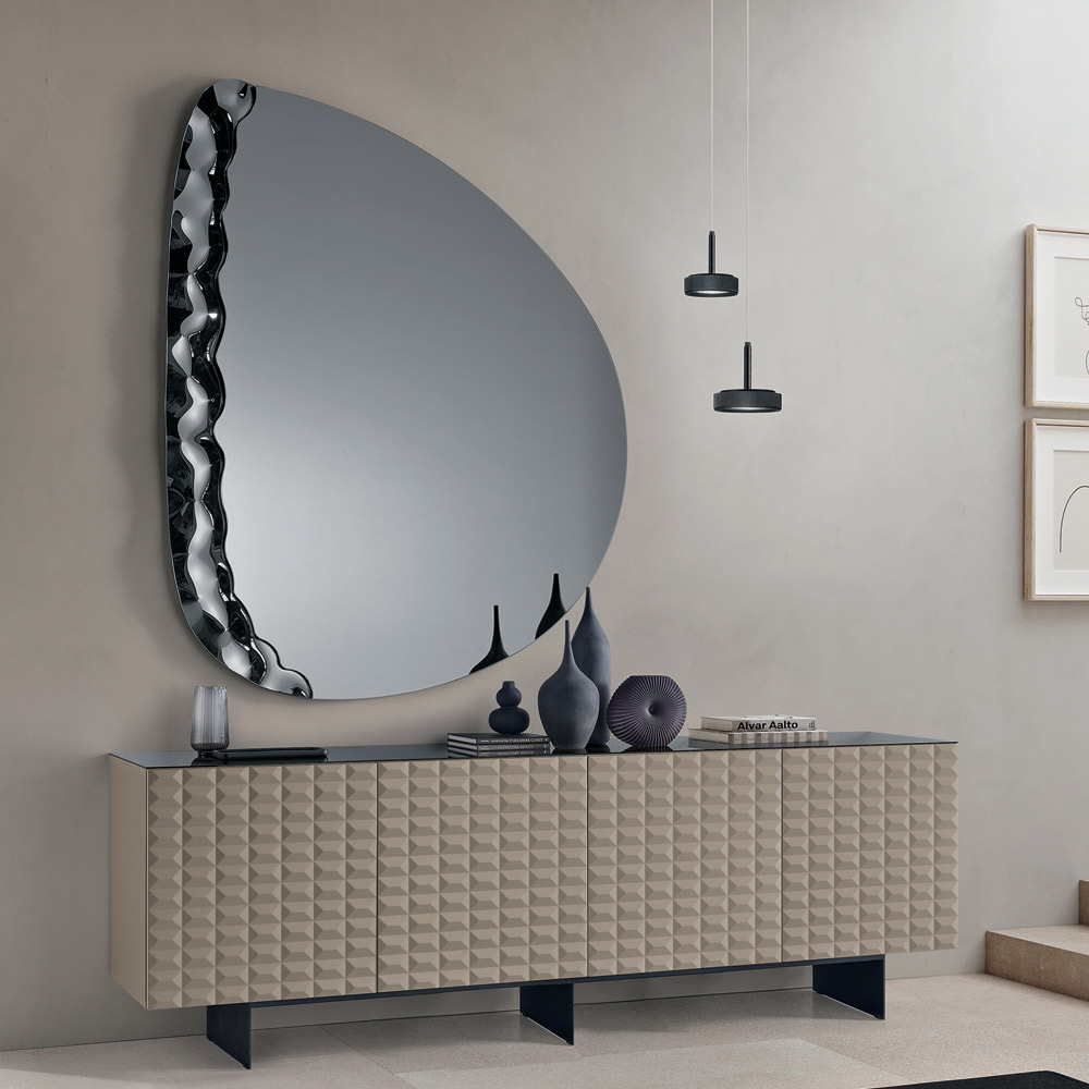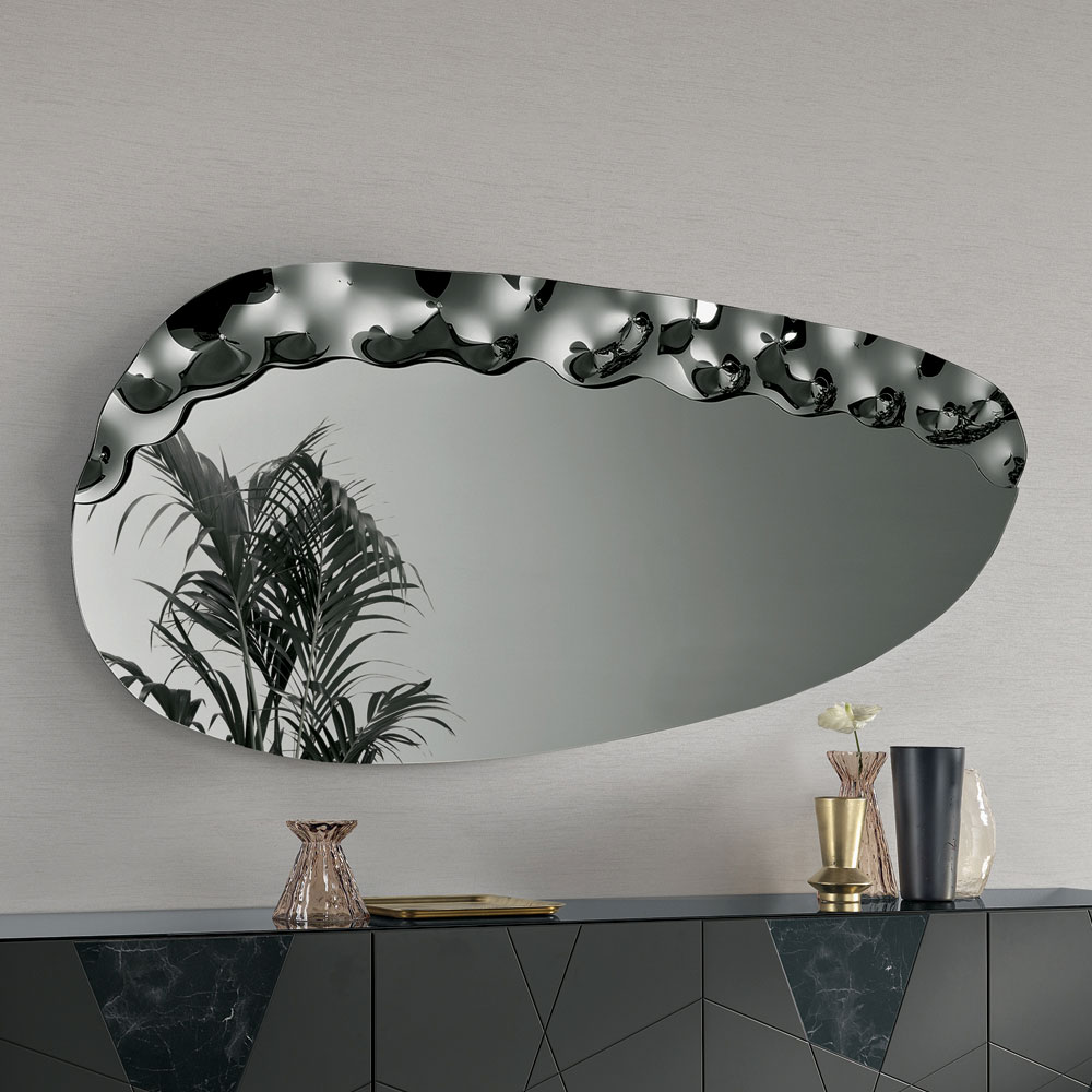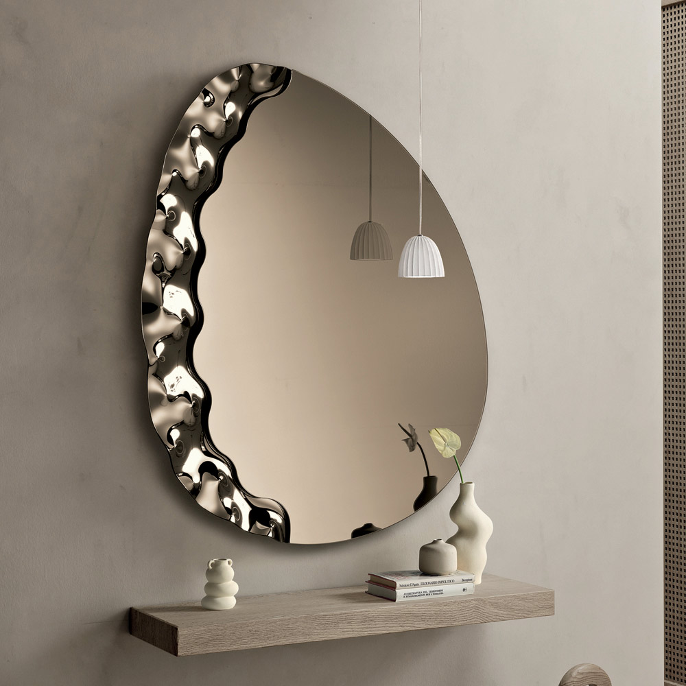 An elegant wall mirror designed in Italy , ideal for enhancing spaces such as the entrance , living room , or bedroom . Its contemporary design combines soft lines and textured details, transforming the mirror into a refined decorative element capable of elegantly enhancing the wall.