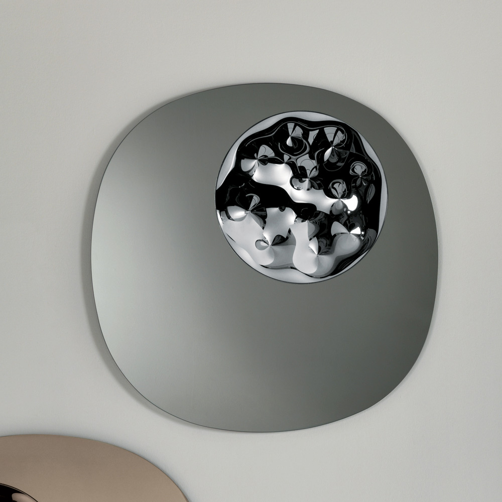 The design is embellished with a distinctive circular insert in tone-on-tone curved glass , positioned on one side of the frame. This detail creates a refined play of light and reflections that enriches the mirror's surface with an original and contemporary touch.