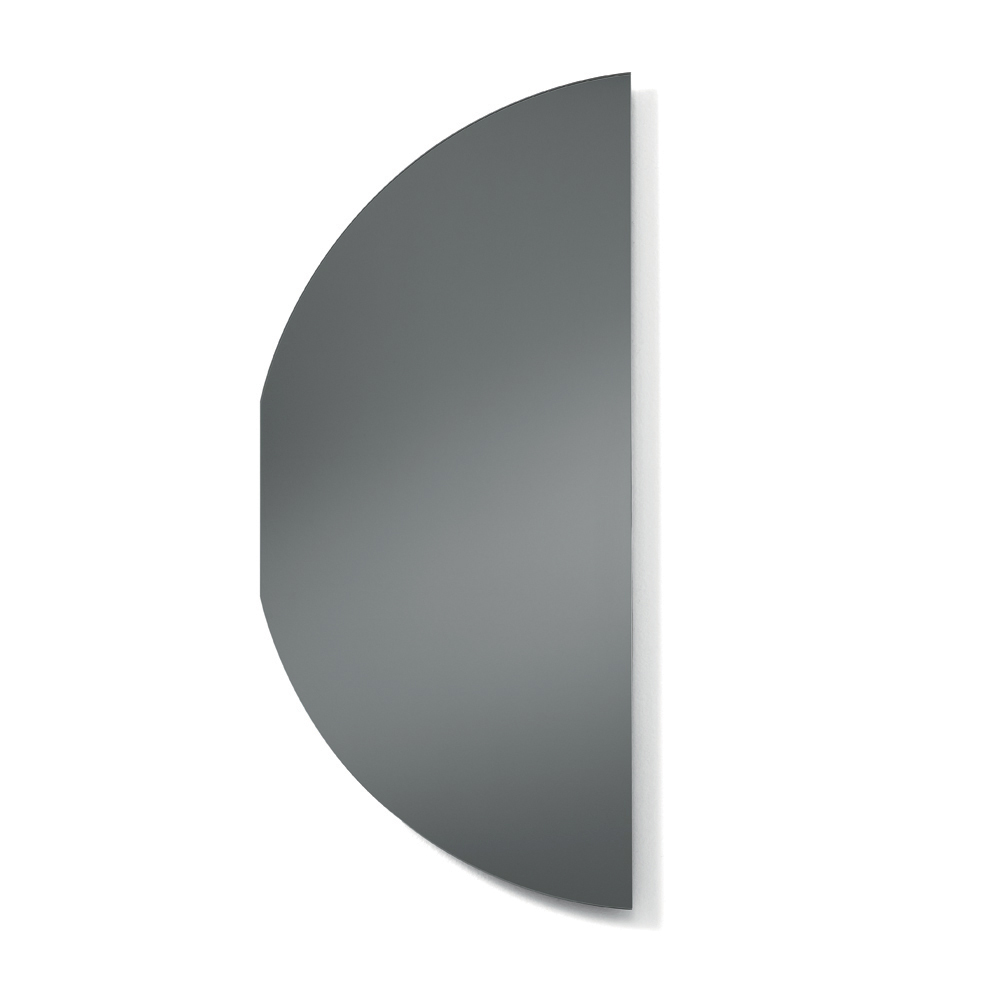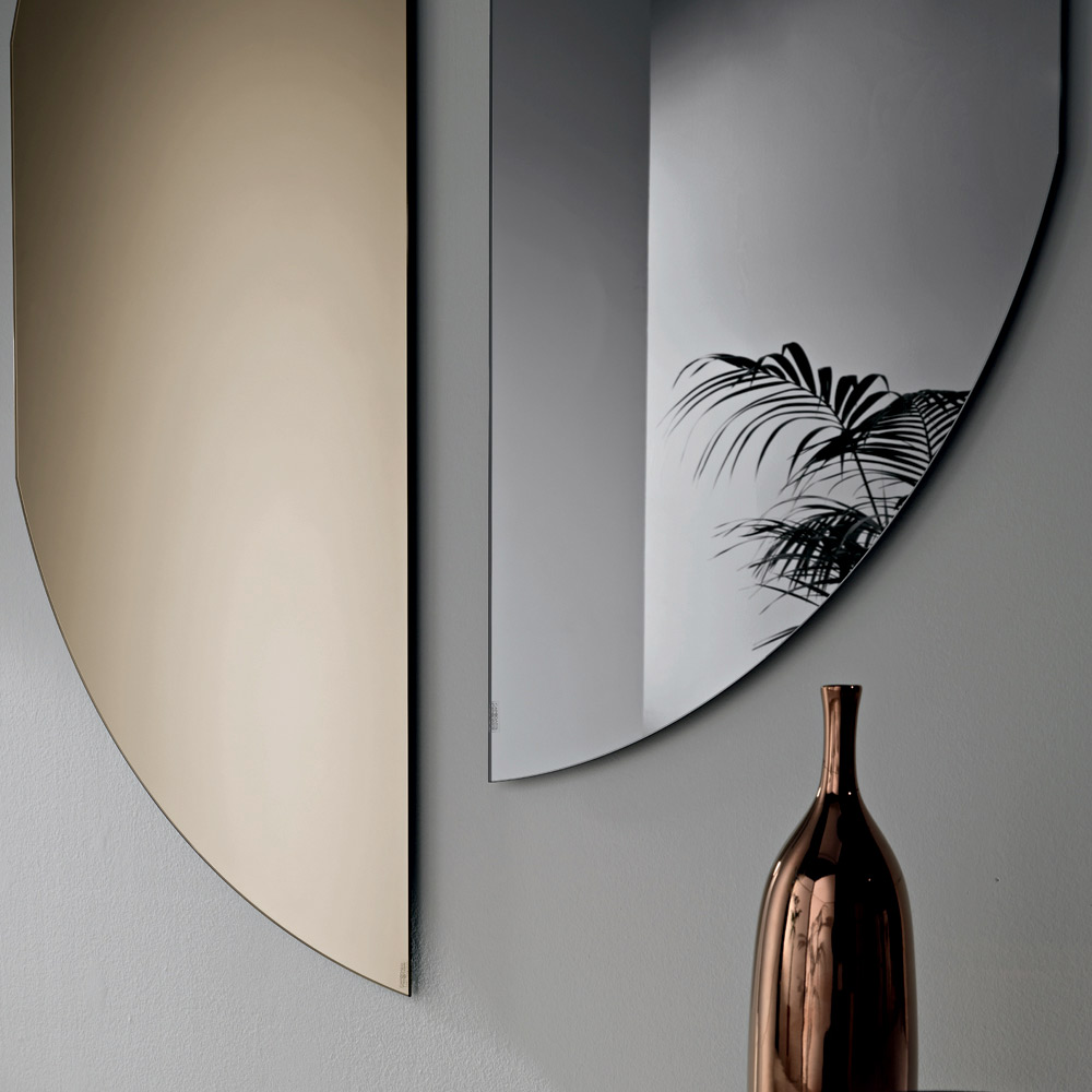 The mirror features a contoured shape reminiscent of a semicircle with an interrupted curve , creating an original and harmonious silhouette. This essential geometry gives the mirror a strong visual presence while maintaining a minimalist and refined aesthetic.