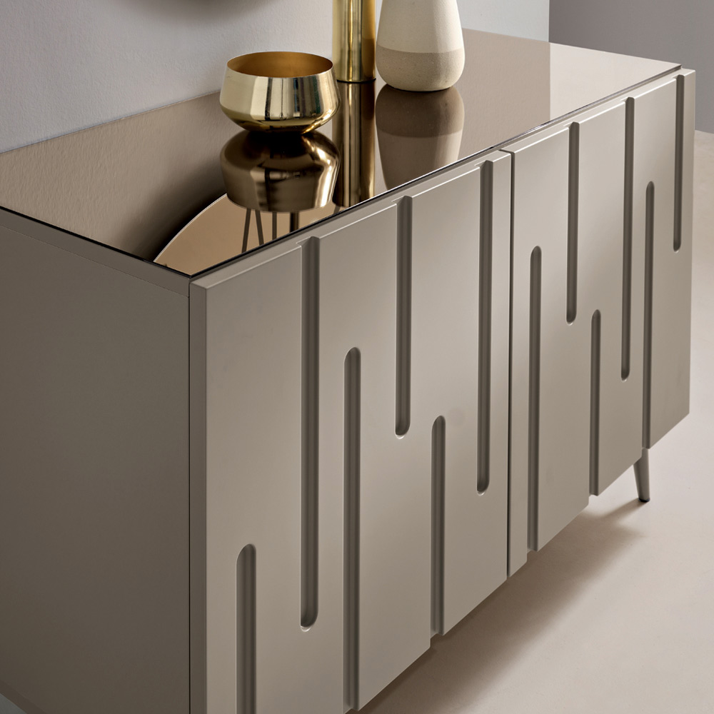 The PVC-coated MDF doors feature irregular vertical incisions that recall the natural flow of stalactites and stalagmites , creating a refined, textured and dynamic effect. This interplay of reliefs gives depth and movement to the surface, enhancing the light and making the sideboard the centerpiece of the space.