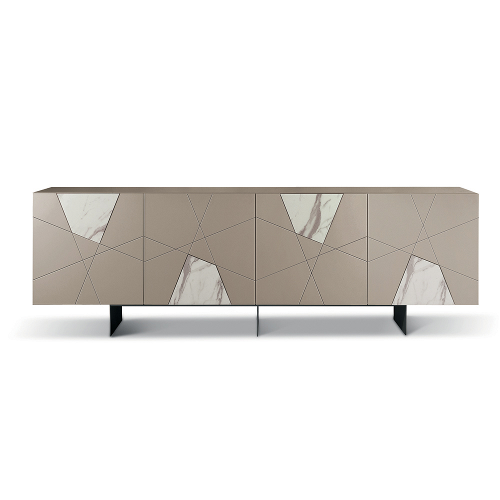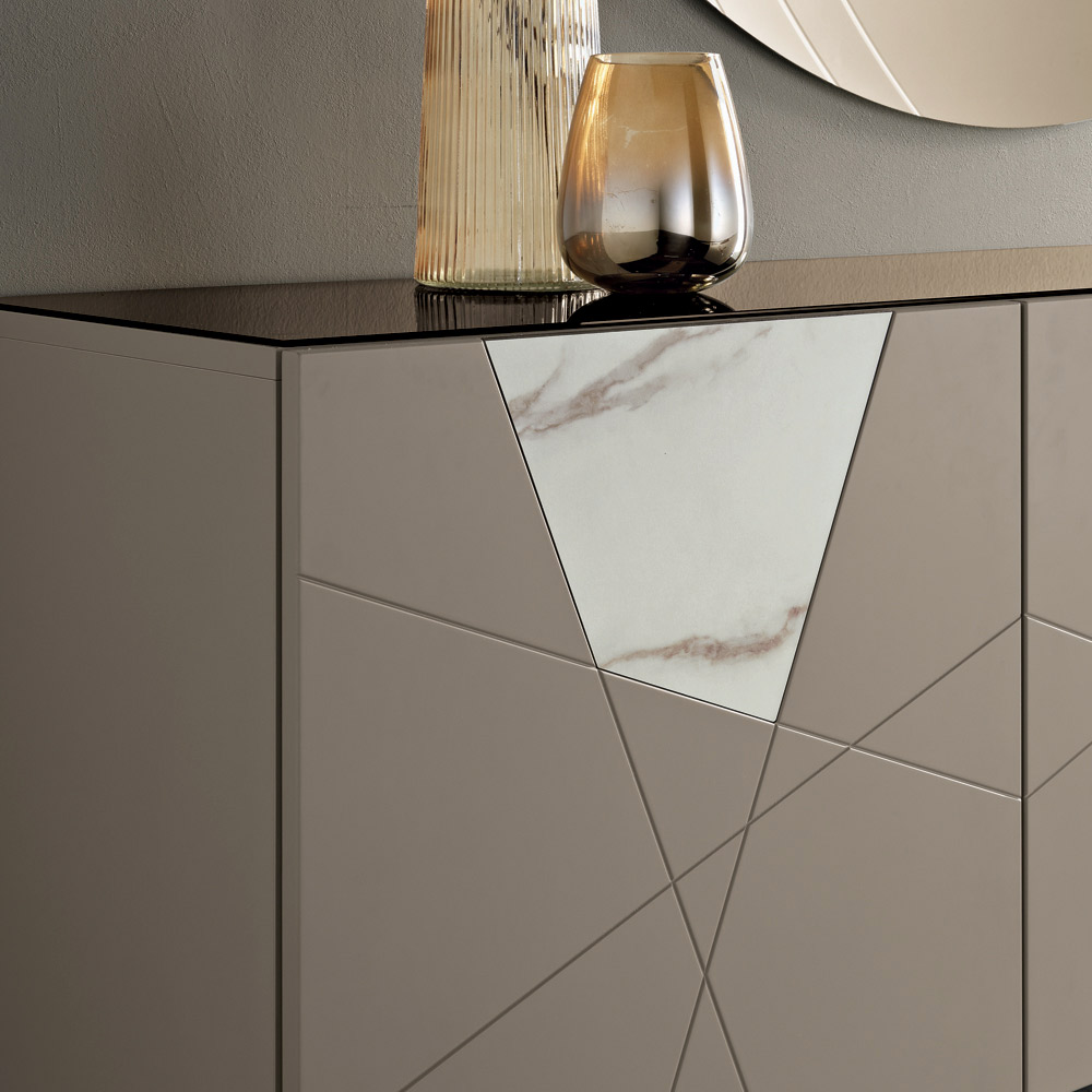 Sideboard with 4 Doors in Lacquered Pantographed MDF and Marble-Effect Glass Inserts - Danila