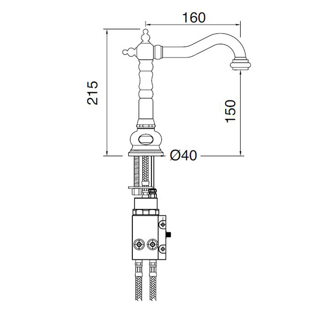 It is an electronic tap controlled by a photocell . Placing the hand in front of the photocell, the impulse is generated for the opening of the water flow valve. Removing the hand, after a minimum time, generates the opposite impulse. The water mixing is automatic and can be adjusted by means of a register positioned in the box that remains under the sink which acts as a “control unit” for the tap. The product is proudly of a unique and exclusive