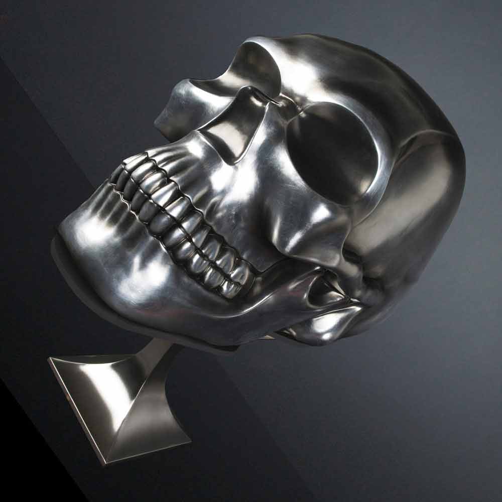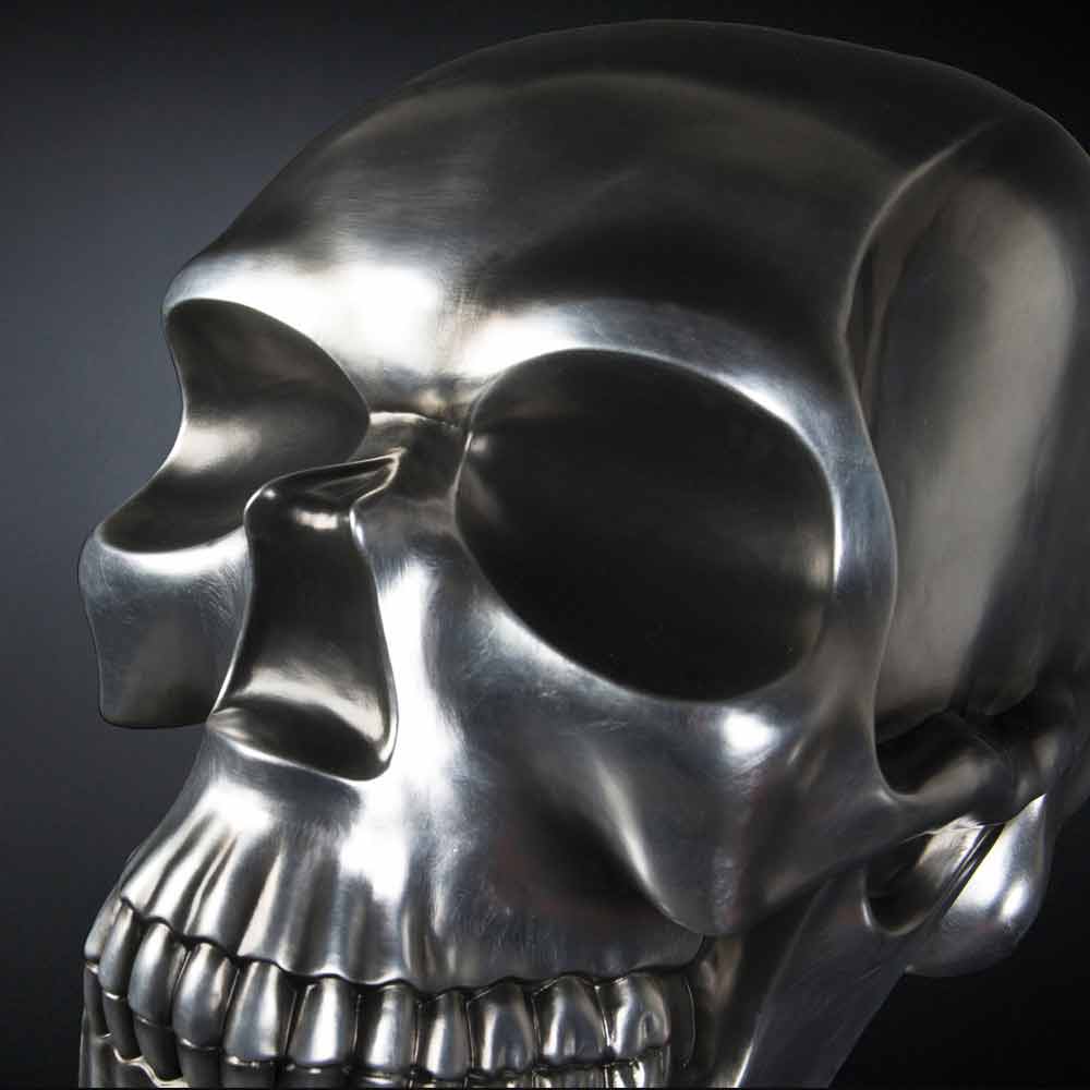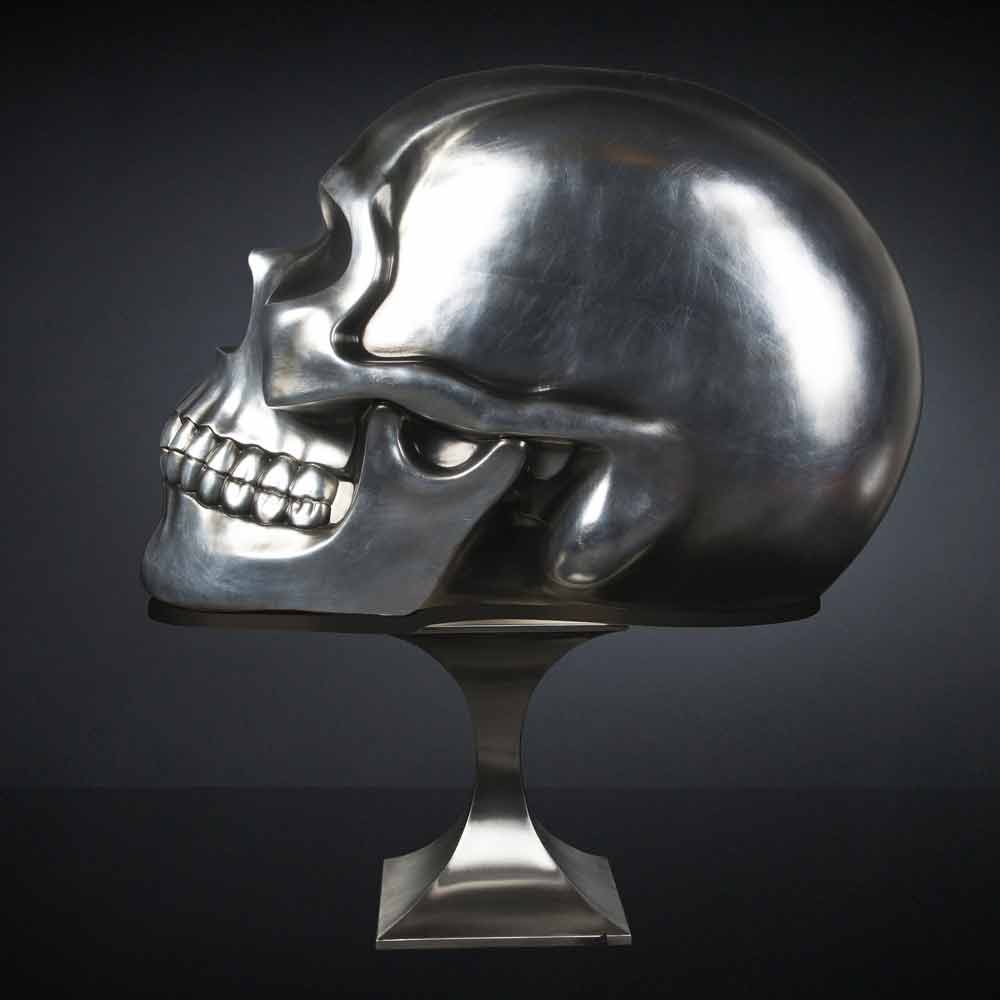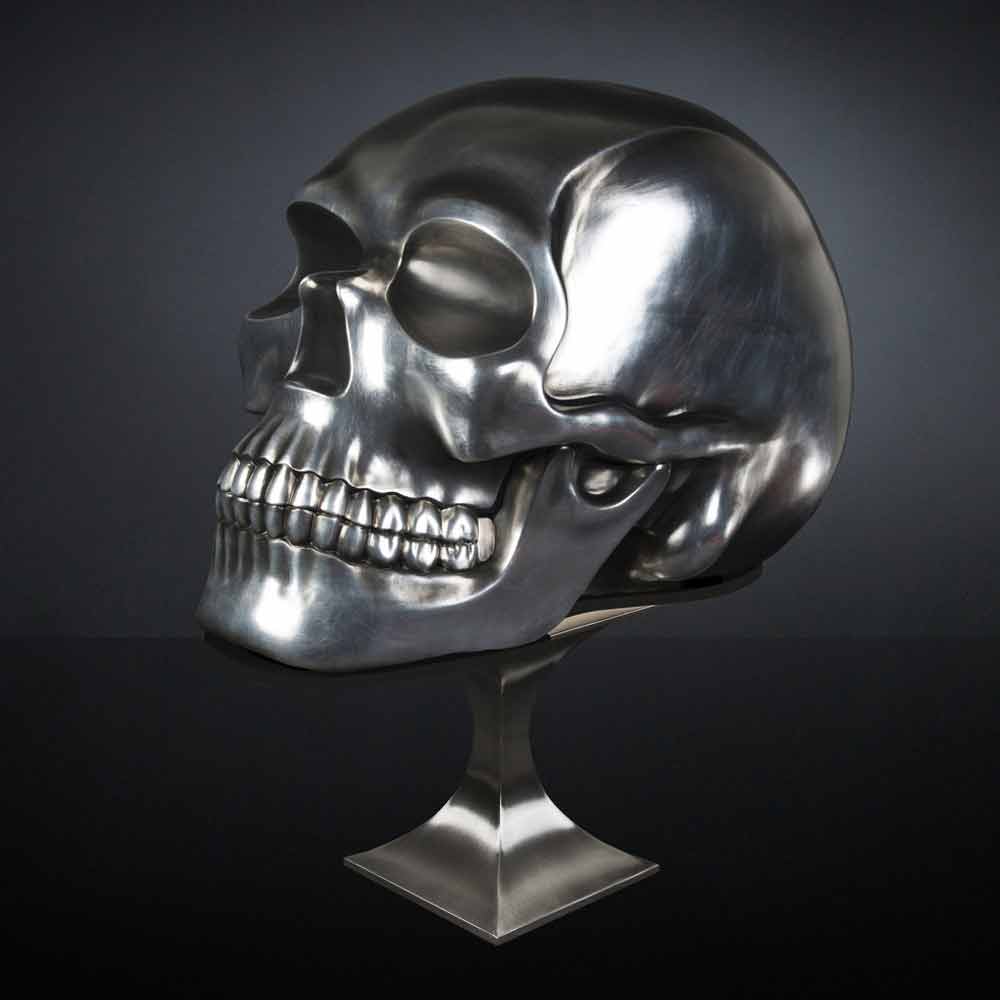 Skull-shaped statue made in Italy in silver ceramic, luxury.