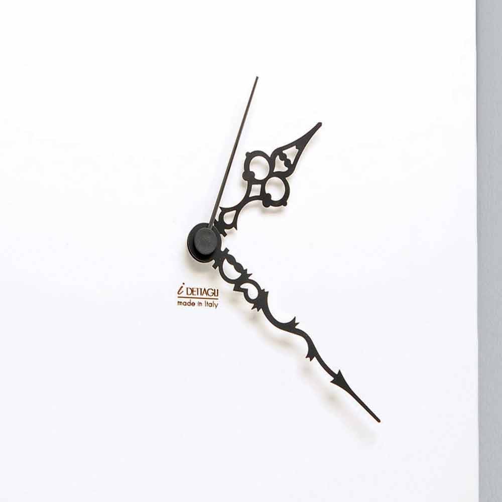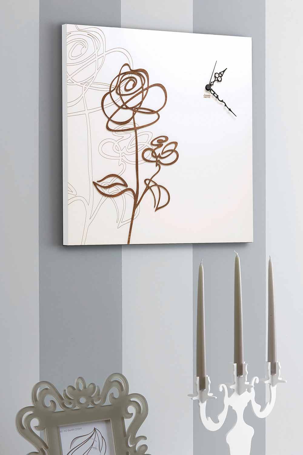 Square wall clock in white wood with floral decoration in dark wood, modern design made in Italy.