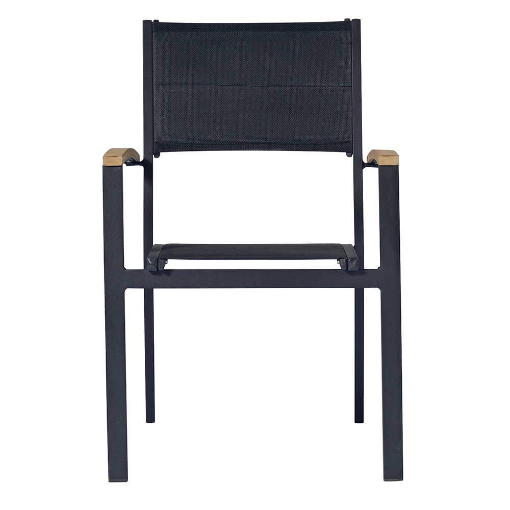 Garden chair made of anthracite gray aluminum with seat and back in black padded textilene complete with elegant teak armrests . The shapes of the structure adapt best to the silhouette of the body to offer great comfort thanks also to the practical armrests that allow you to maintain a correct and comfortable position . Ideal for furnishing your outdoor spaces with a touch of unique style and a strong modern personality .