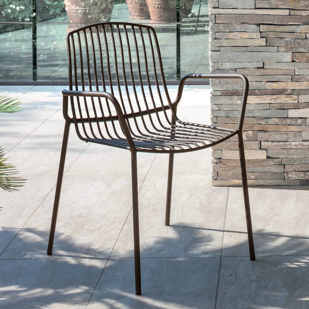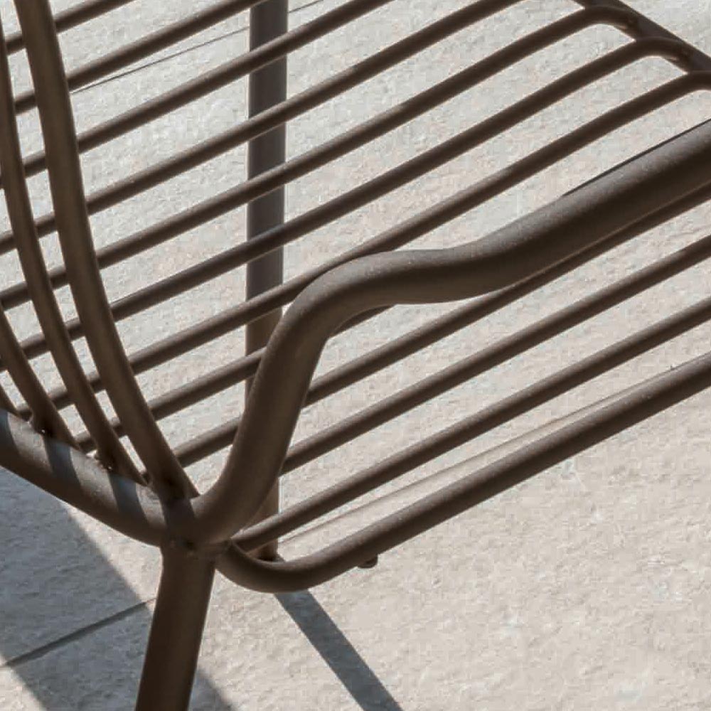 Outdoor chair entirely made in Italy in embossed painted metal . Its essential aesthetics is characterized by the particular wire weave that follows the ergonomic shapes of the structure in a harmonious and sinuous way, adapting better to the silhouette of the body in order to offer a comfortable seat maximized in the version with armrests which allow you to maintain a correct posture and comfortable . A piece of furniture that comes from a 100% Made in Italy artisan production process through the use of high quality raw materials that offer a solid and resistant result .