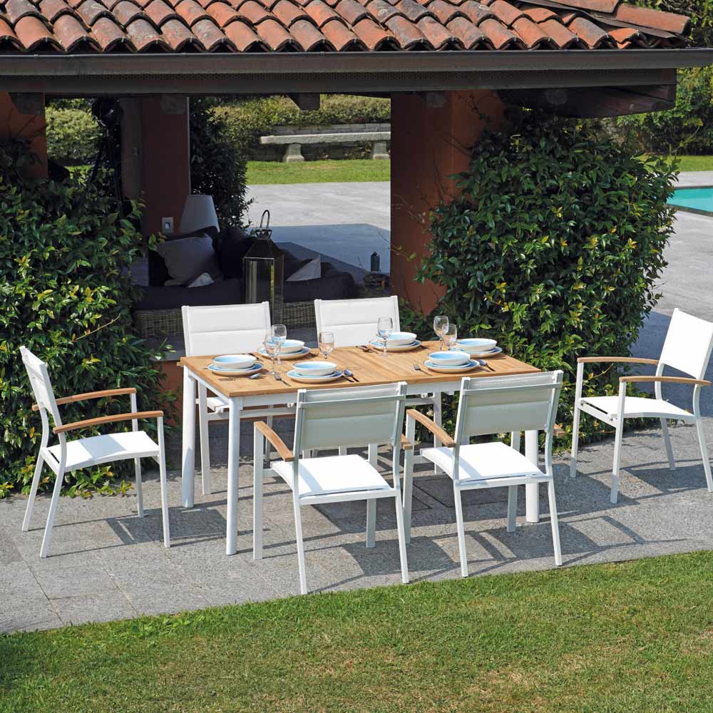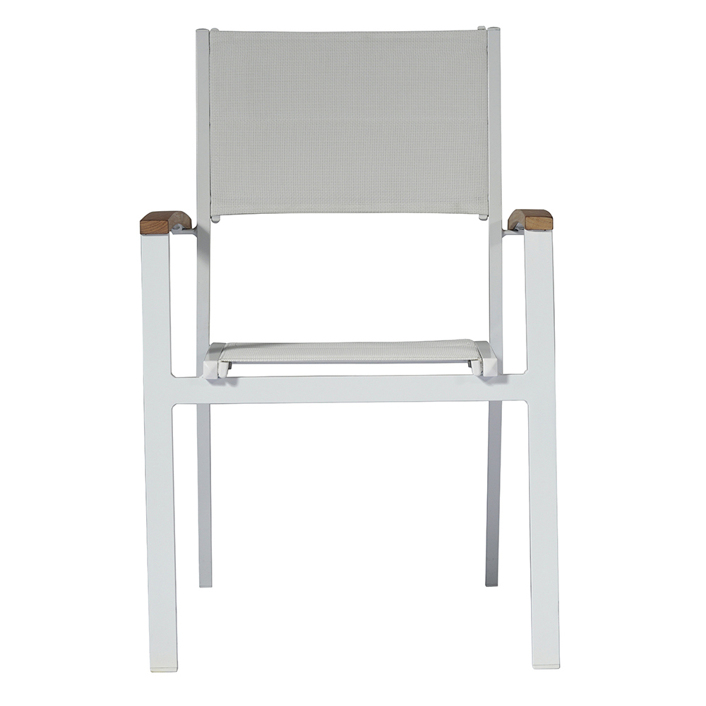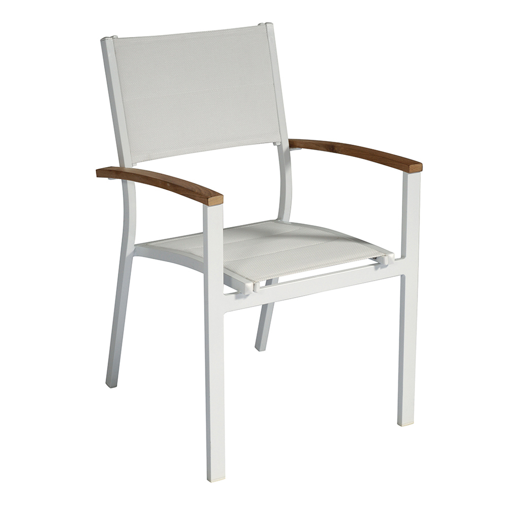 Stackable outdoorchair with structure made of aluminum and seat in ivory paddedtextilene enriched by elegant teakarmrests. This outdoor chair combines design and simplicity, the result of simple but resistant materials that give life to a product with an original and avant-garde design, perfect to complete any context.