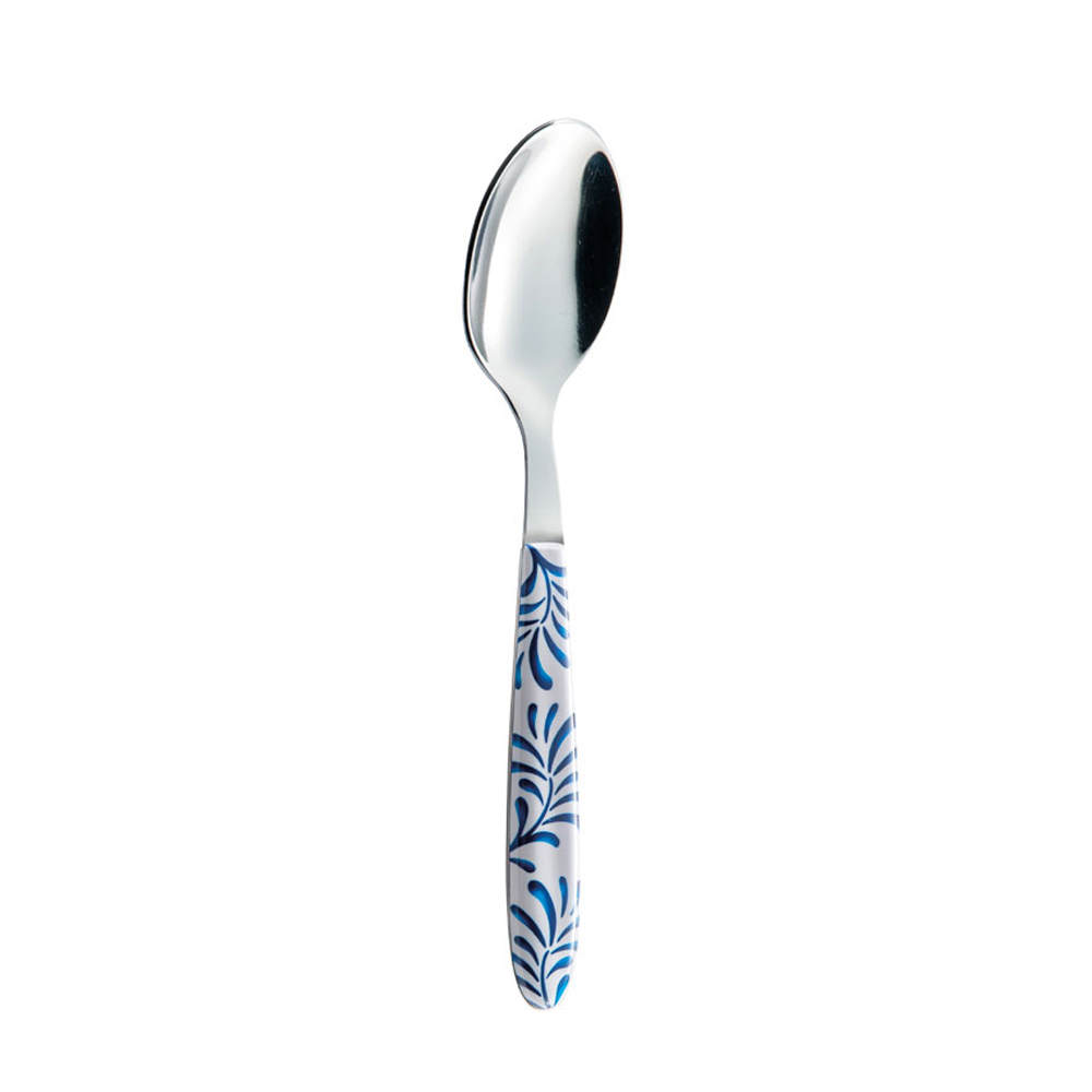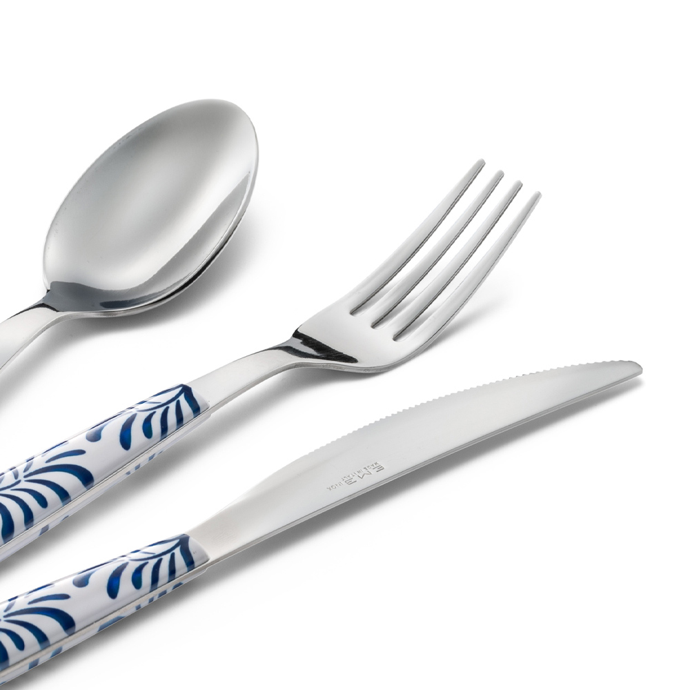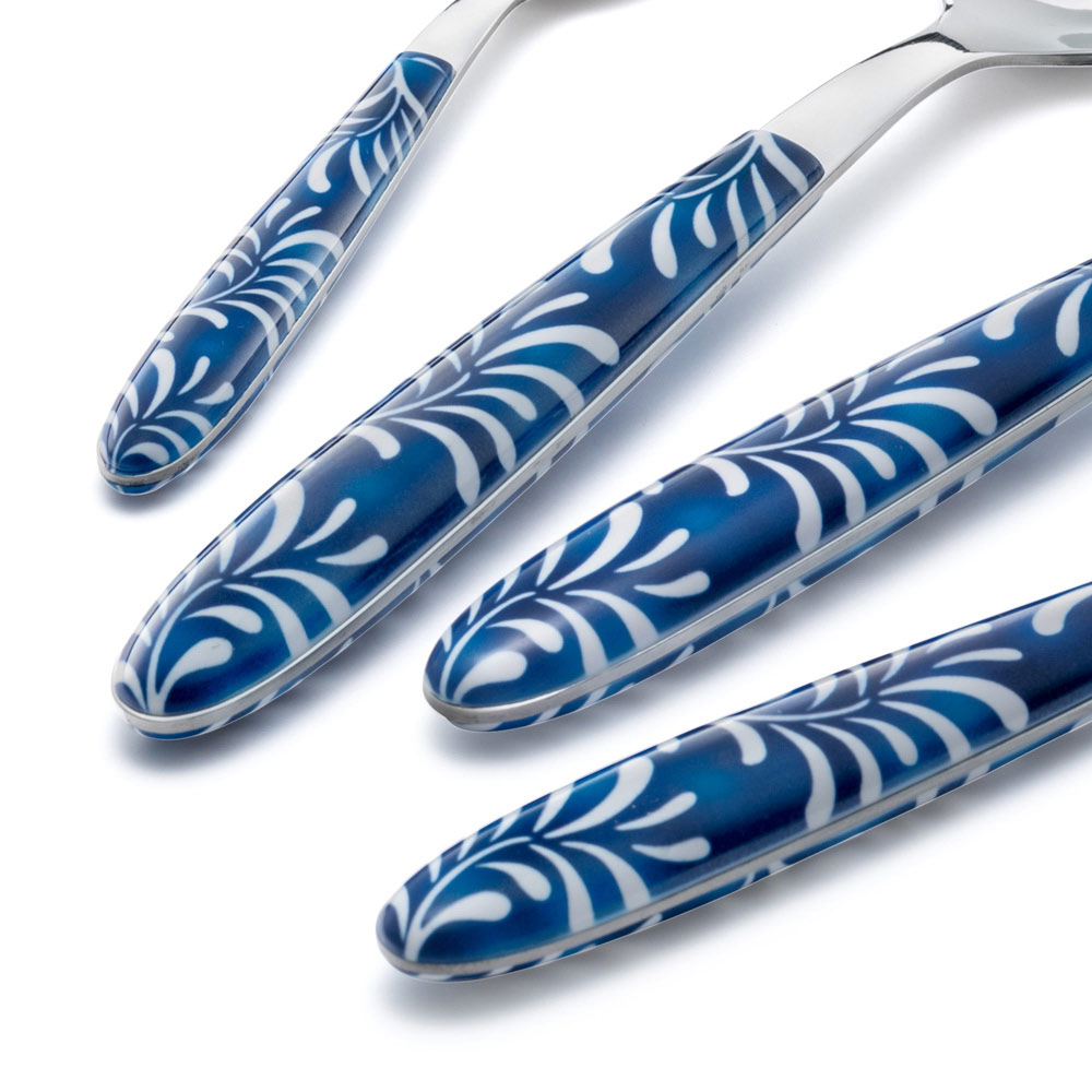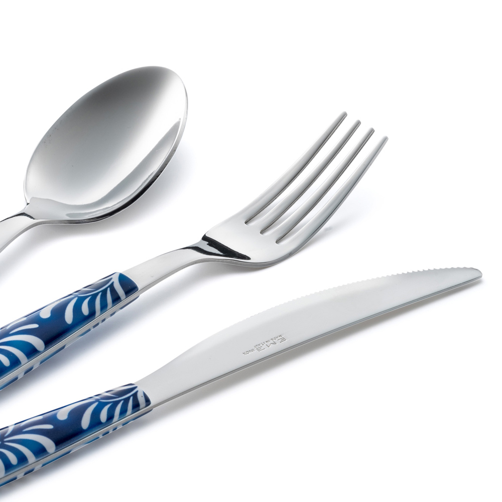 Stainless steel cutlery set and white or blue decorated plastic handle, 24 pieces made in Italy.