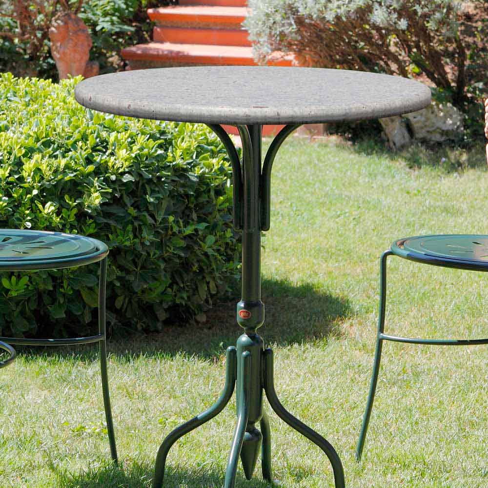 Outdoor coffee table handcrafted in Italy with round stone top and green painted iron base. A furnishing accessory for outdoor environments characterized by classic features that bring to mind a design of the past enriched and made unique by the particular finish that covers the entire base, distinctive elements of the coffee table. The stone top, on the other hand, gives an exclusive touch while providing a solid and resistant support surface as well as the structure which, thanks to the hot galvanizing , guarantees the rustproofness of the metal for decades and excellent resistance to any agent. corrosive. The craftsmanship made in Italy also allows us to offer a high quality product that stands out thanks to the use of exclusive materials , attention to detail and fine finishes. What is born is therefore a functional , durable and high quality product.