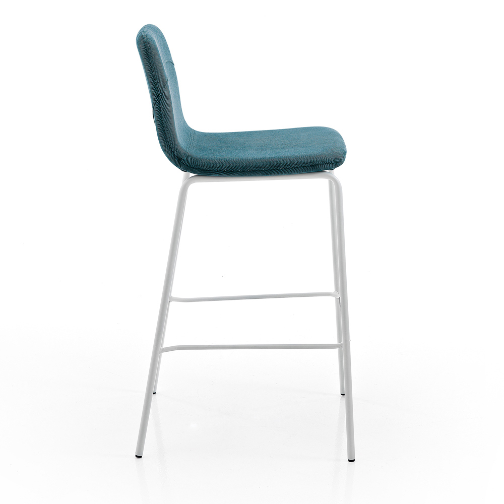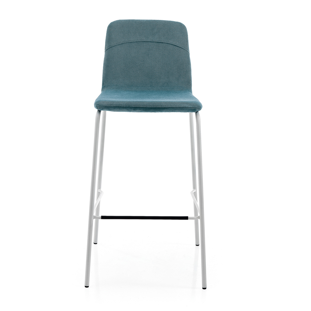 High kitchen stool made in Italy with round tube metal structure (diameter 16 mm) complete with practical footrest and seat covered in fabric . A functional and timeless design , suitable for those who want to create a welcoming environment with delicate shades.