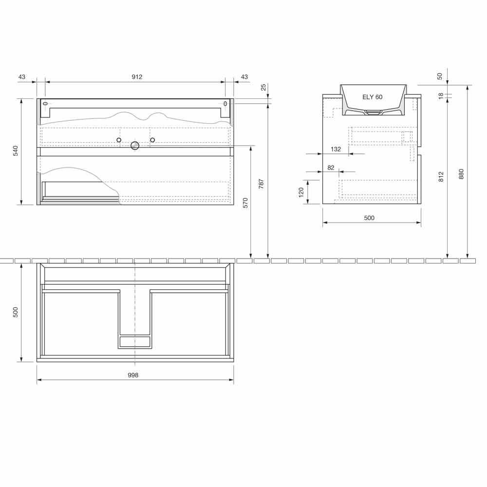 The washbasin base with a standard drawer and a shaped drawer is made of laminated and water-repellent hydro W 100 wood fiber , in order to ensure greater durability and prevent the cabinet from being damaged in contact with water.