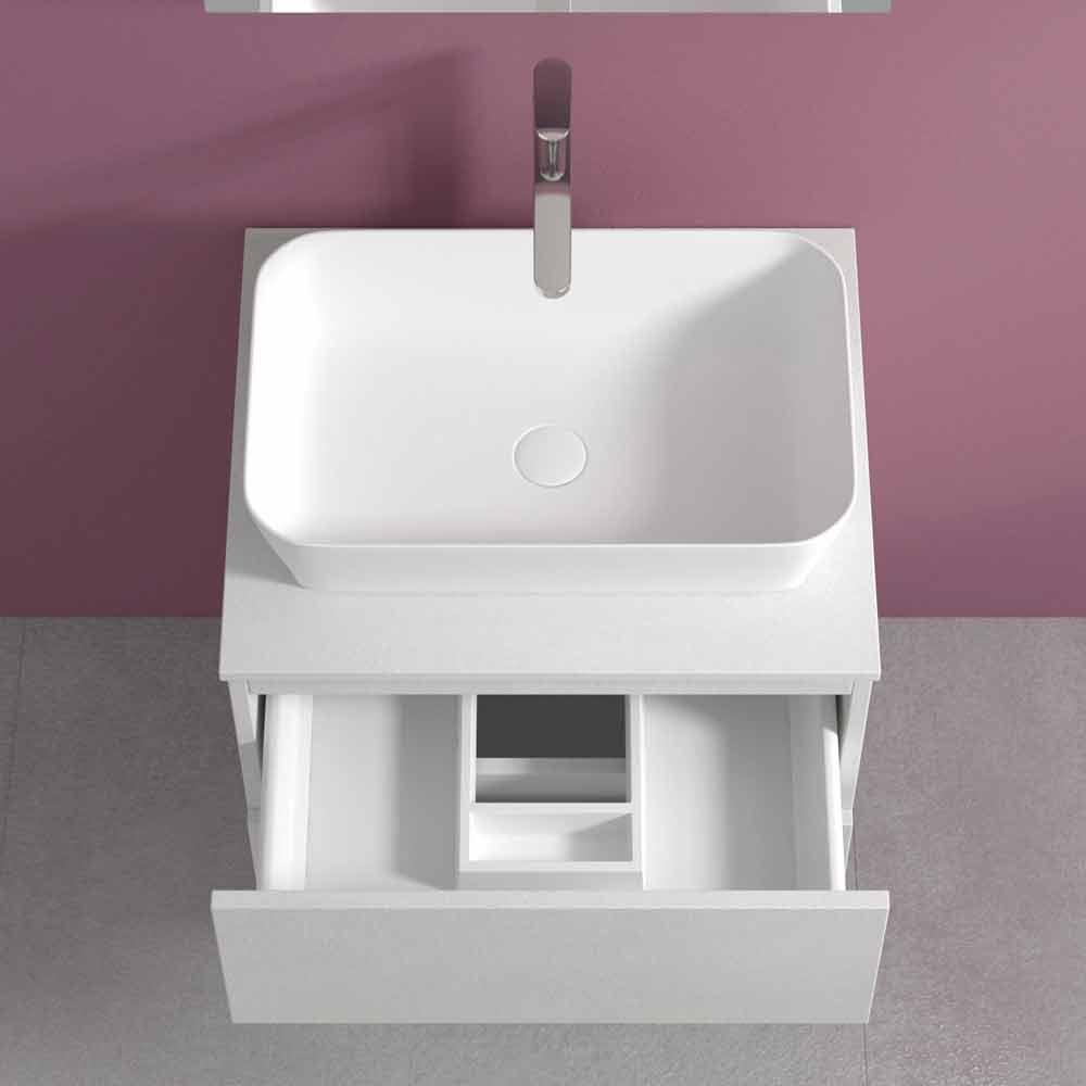 The suspended bathroom furniture has a clean and minimal design with a rectangular countertop washbasin , for a modern and timeless result that also pays attention to practicality and functionality.