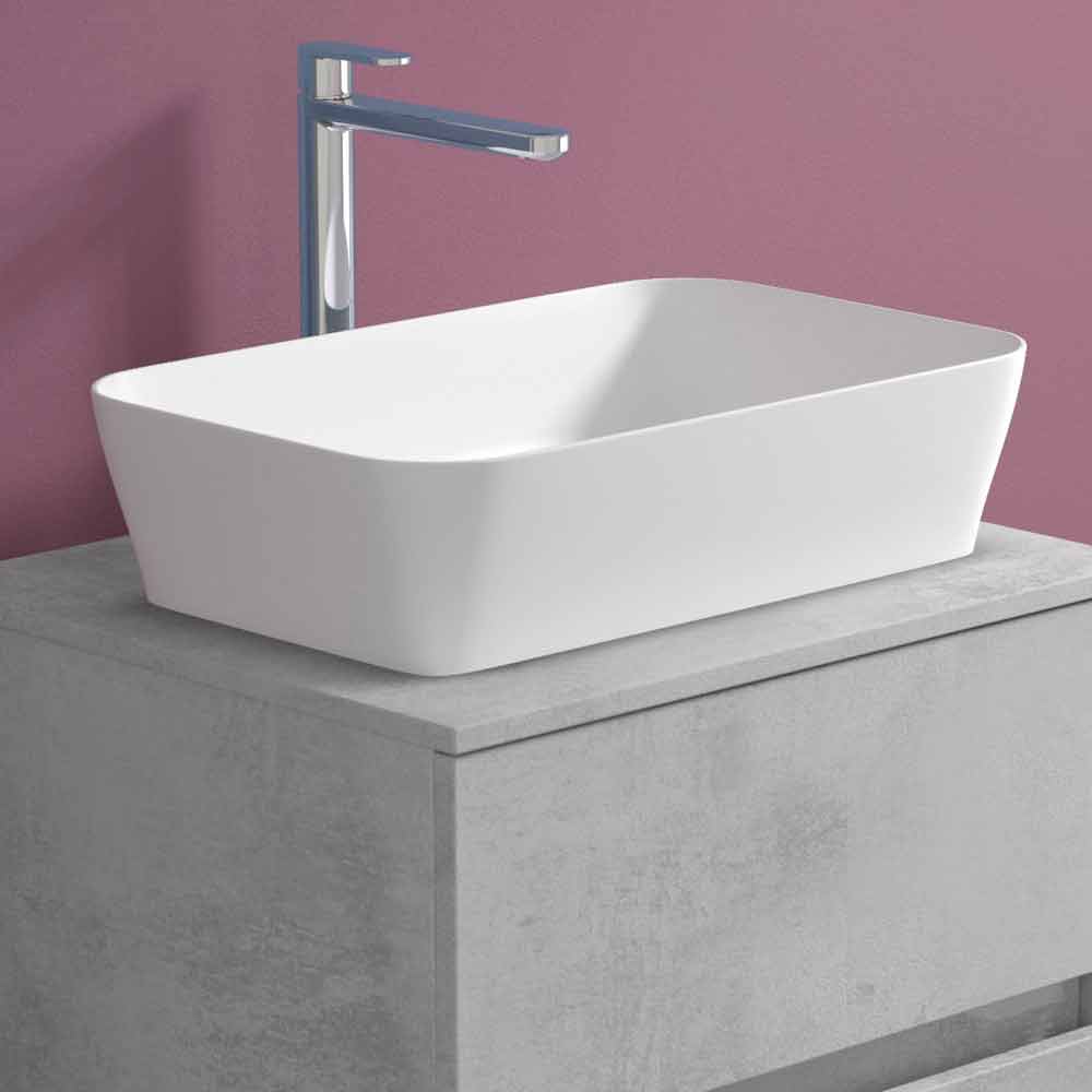 The rectangular countertop washbasin is made of Solid matt, an opaque white mineral resin , and finished in opaque gelcoat , which makes the product waterproof.