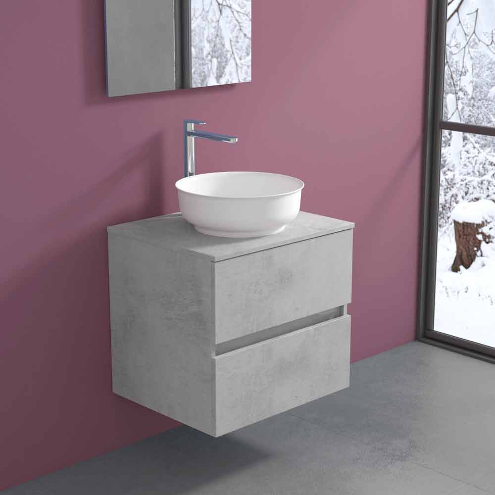 The round countertop washbasin is made of Solid matt, an opaque white mineral resin , and finished in opaque gelcoat , which makes the product waterproof.