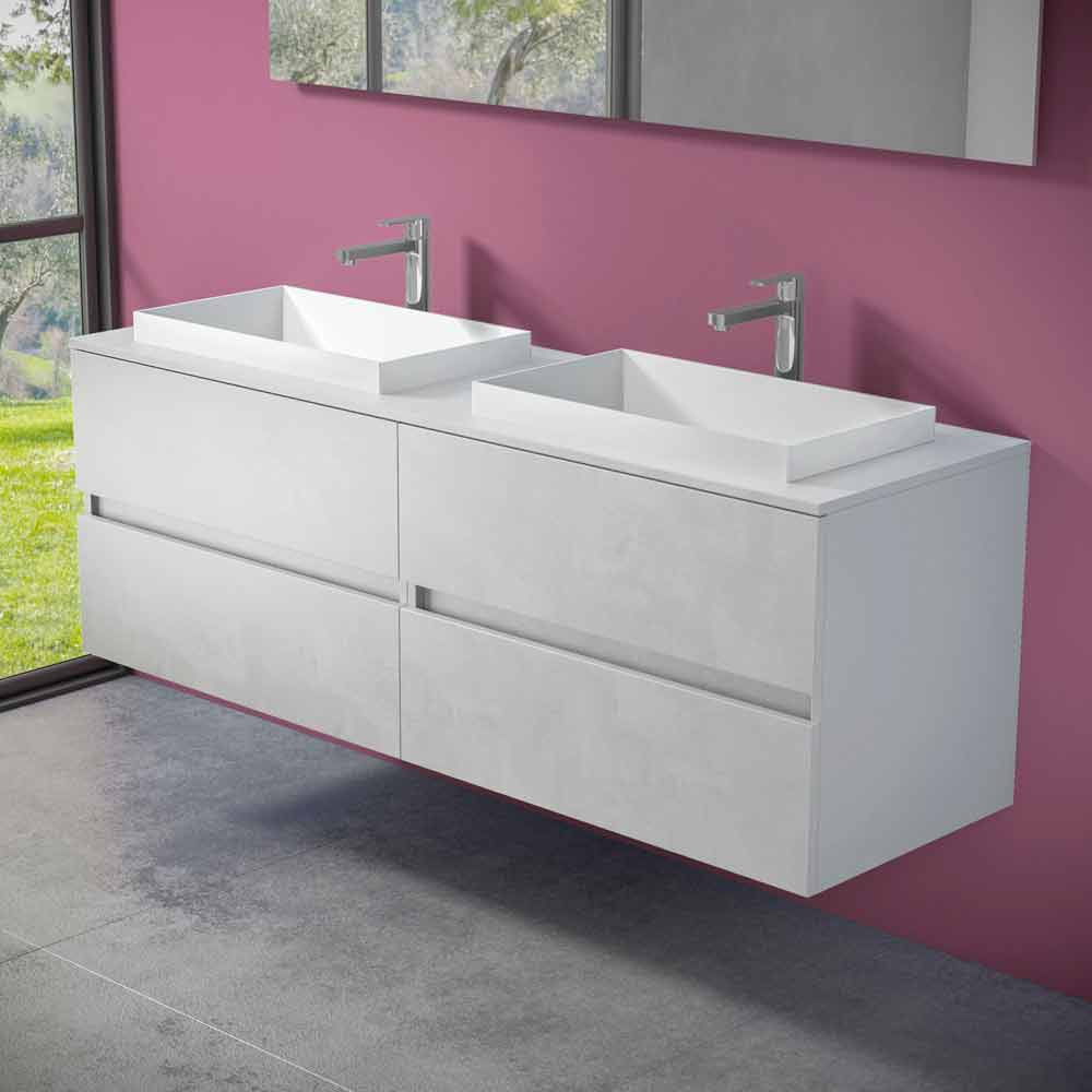 It is a suspended bathroom furniture with double built-in sink that is characterized by a modern and timeless design , paying particular attention to both aesthetics and details as well as practicality and functionality.