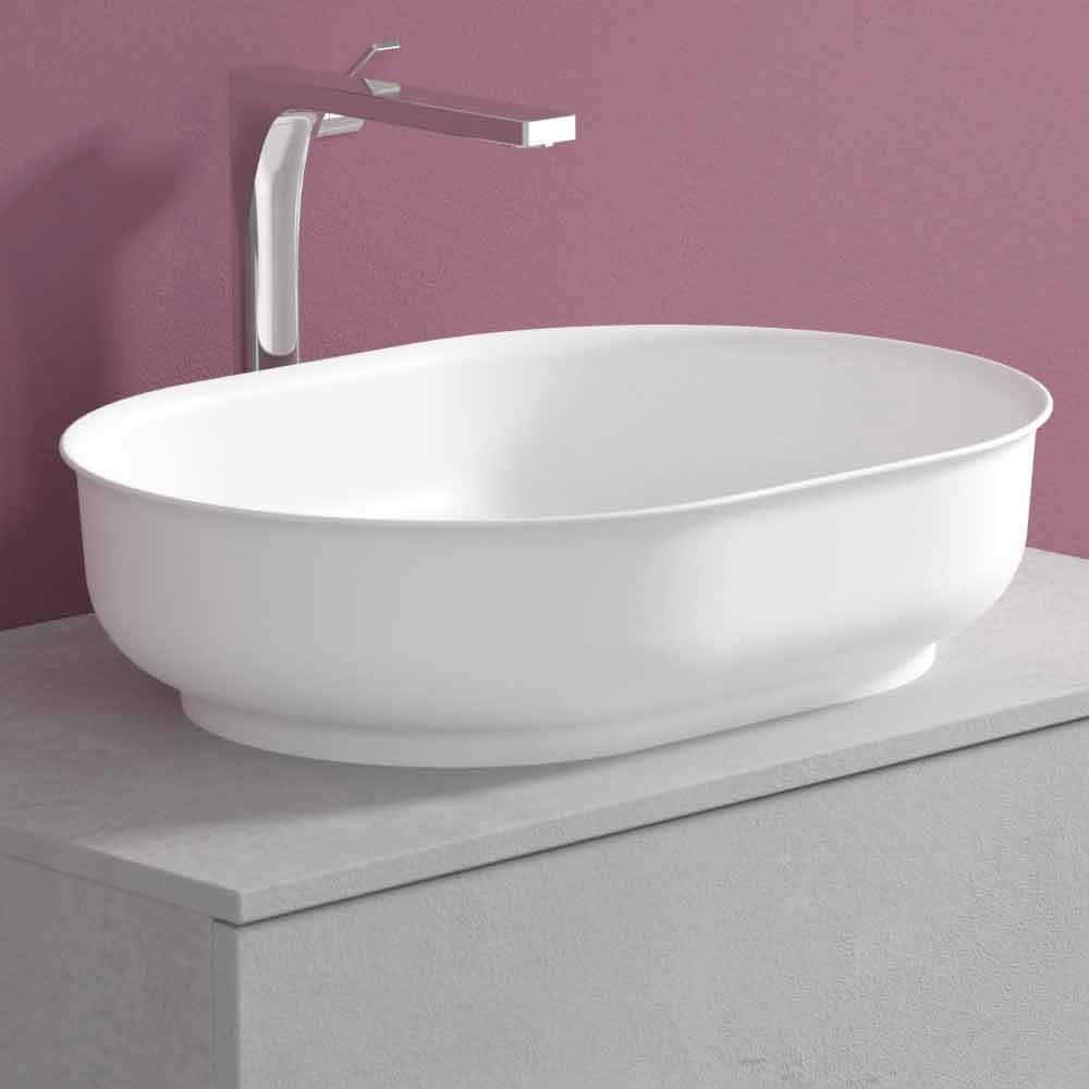 The oval-shaped countertop washbasin is made of Solid matt, an opaque white mineral resin , and finished in opaque gelcoat , which makes the product waterproof.