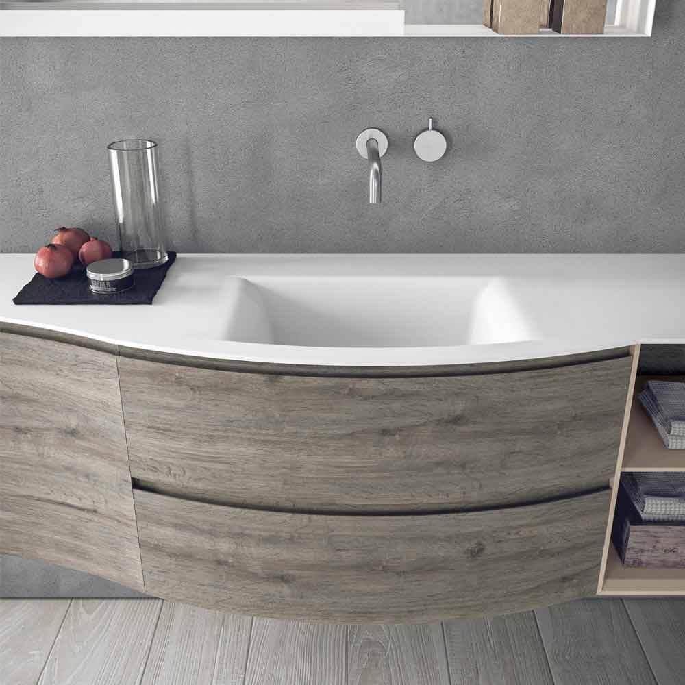 Bathroom set with curved fronts in unicolor HPL oak barrique, integrated washbasin in matt white Teknorit , wall unit and open base in glossy corda lacquer.