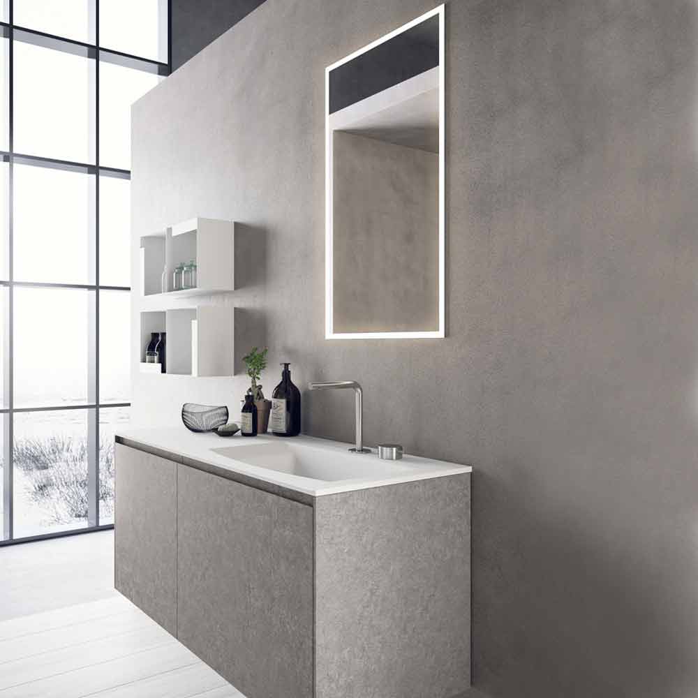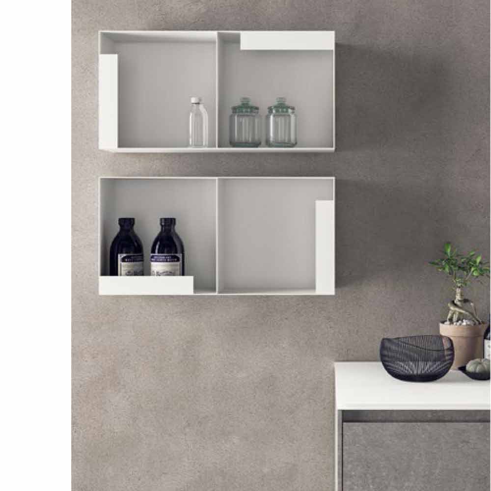 Minimal and modern bathroom composition, suspended design with shelves, made in Italy.