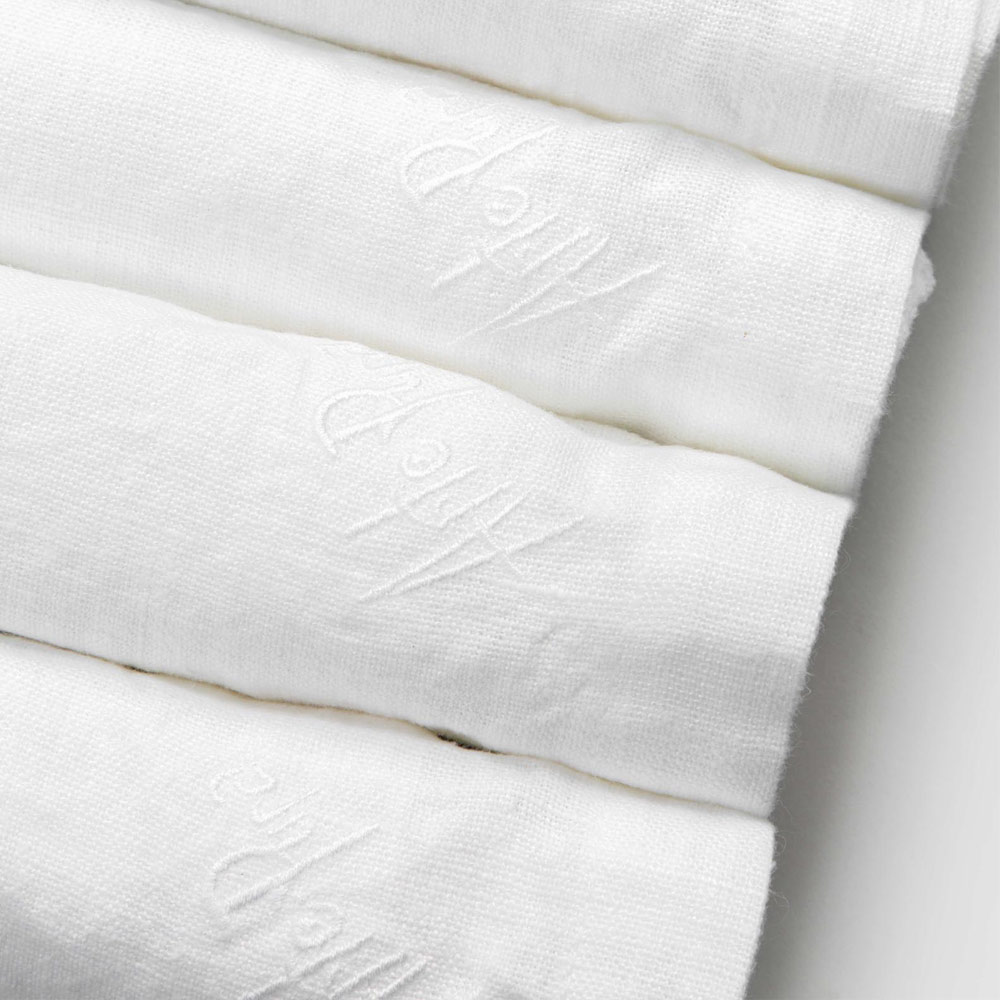 service of 6 heavy white linen napkins with fold edge.