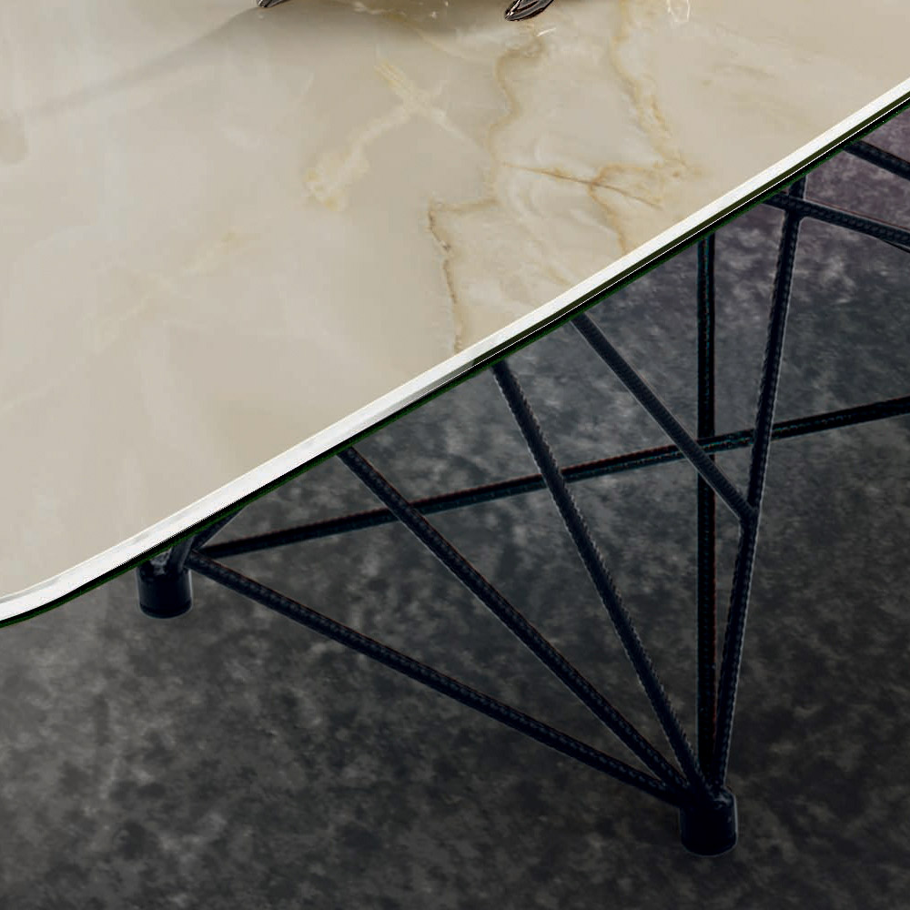 Fixed barrel-shaped living room table with ceramic top ,45° bevelled edge, black lacquered steel base with adjustable feet. The characteristic element of this product is the visual play of lines and shapes created by the steel base which gives the table movement and originality . This furniture is perfect for all those who want to furnish their living or contract environment with a refined and refined touch without sacrificing functionality . The Italian artisans wanted to create a table that was not only beautiful to look at but also usable on different occasions.