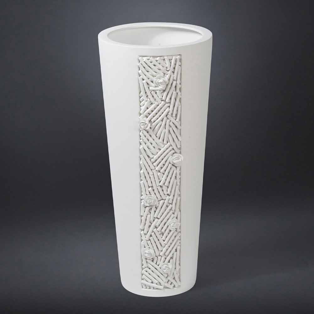 Tall decorative vase made in Italy in opaque white ceramic through craftsmanship . A simple and essential style completed and enriched by a refined detail with a log texture that characterizes part of the vase's structure making it unique and original. This detail together with the elegant finish chosen give this complement all its eclectic personality making it a perfect solution for spaces characterized by a classy style . The use of ceramics and craftsmanship make it an exclusive and refined decorative element, increasing its value and emphasizing its quality. An ideal aesthetic for the most varied environments, from home furnishings to that of hotels, restaurants, contract areas, spas but also as a setting for events and weddings.