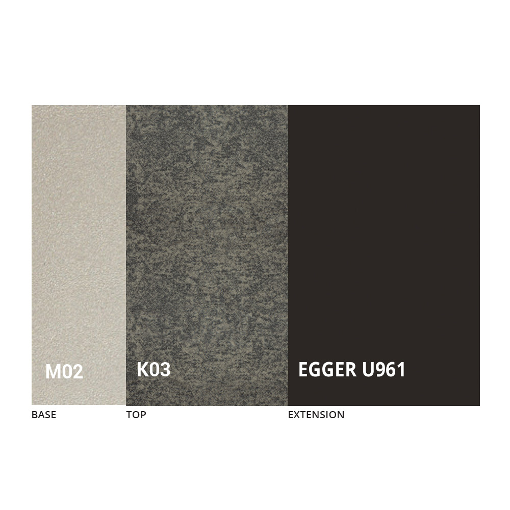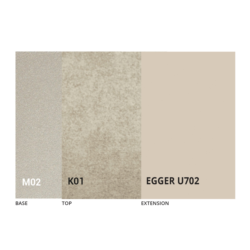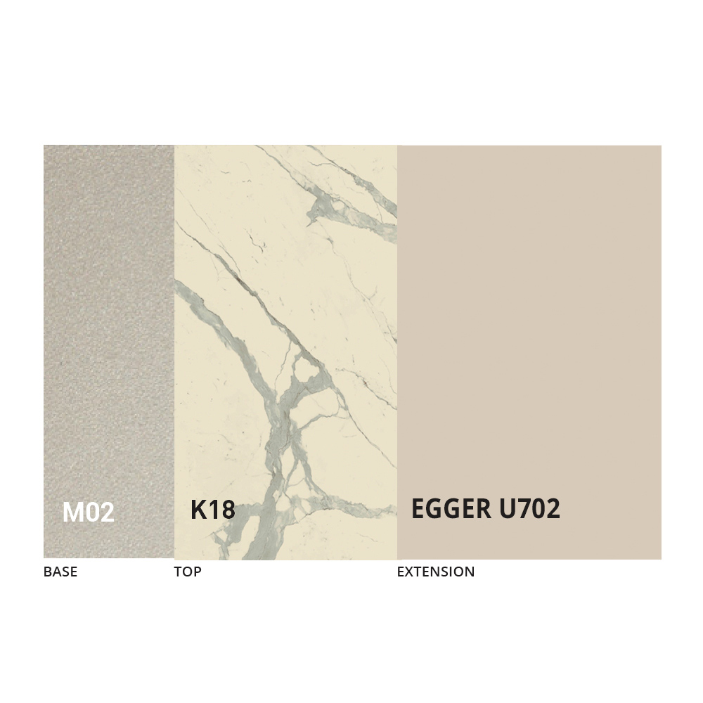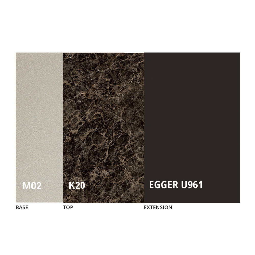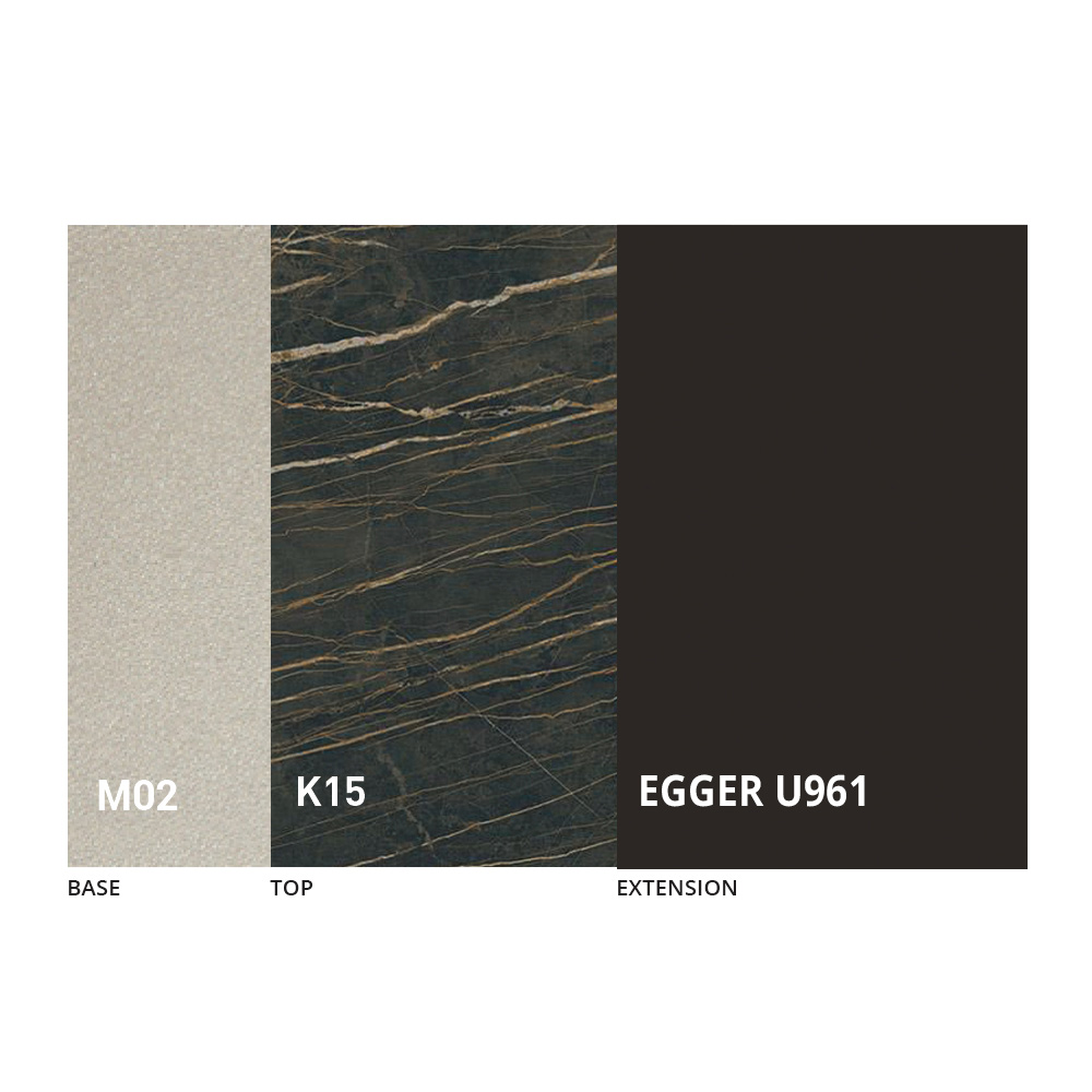 The top is available in melamine, matt ceramic, glass and mortar effect in a wide range of finishes.