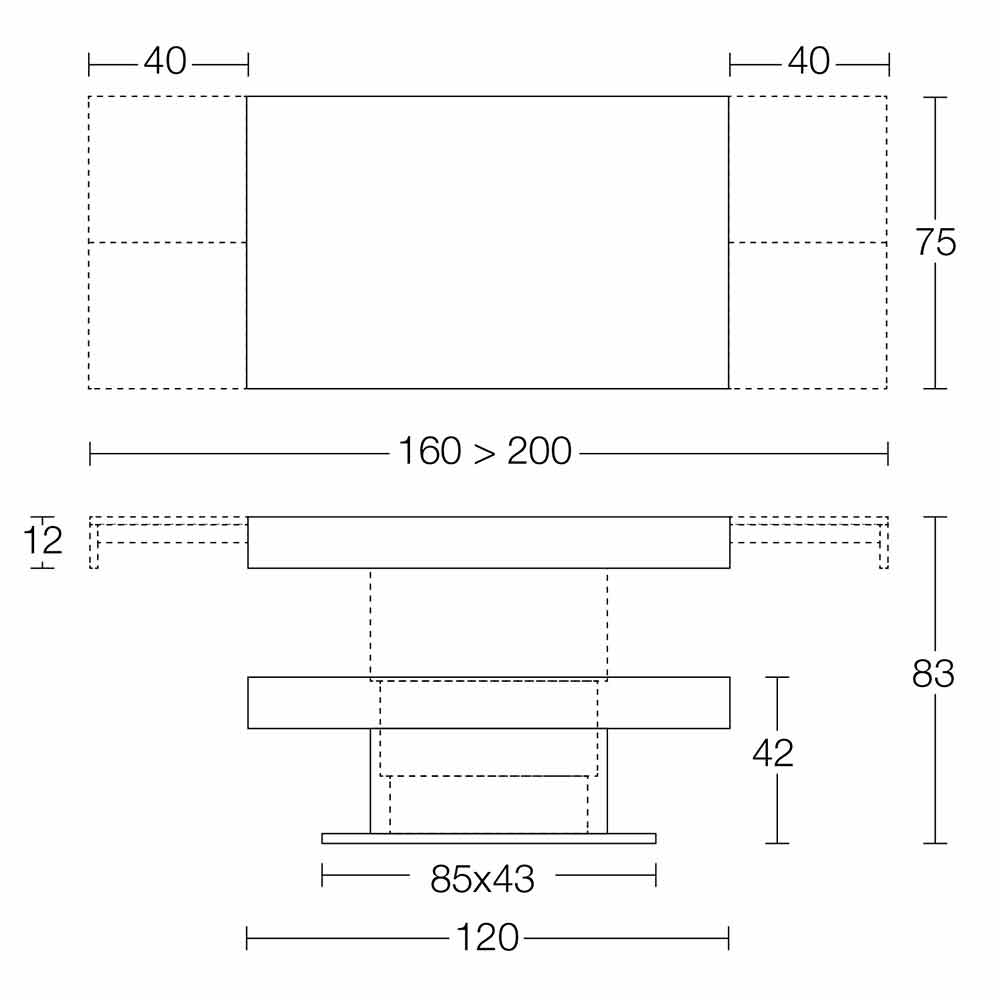 The top is extendable with two side extension leaves of 40cm each (internal).