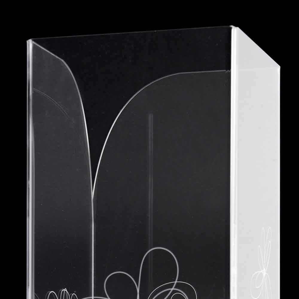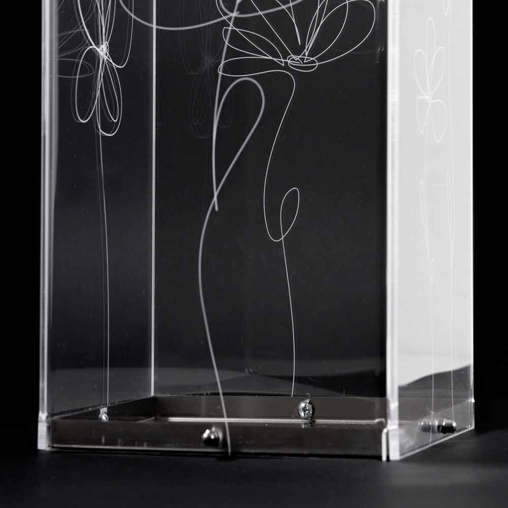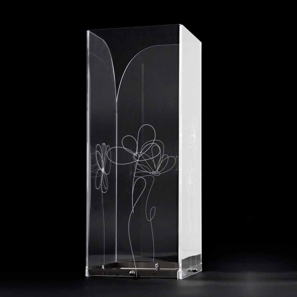 Umbrella stand in transparent plexiglass that is characterized by laser-marked floral decorations with a stylized style with stainless steel base.