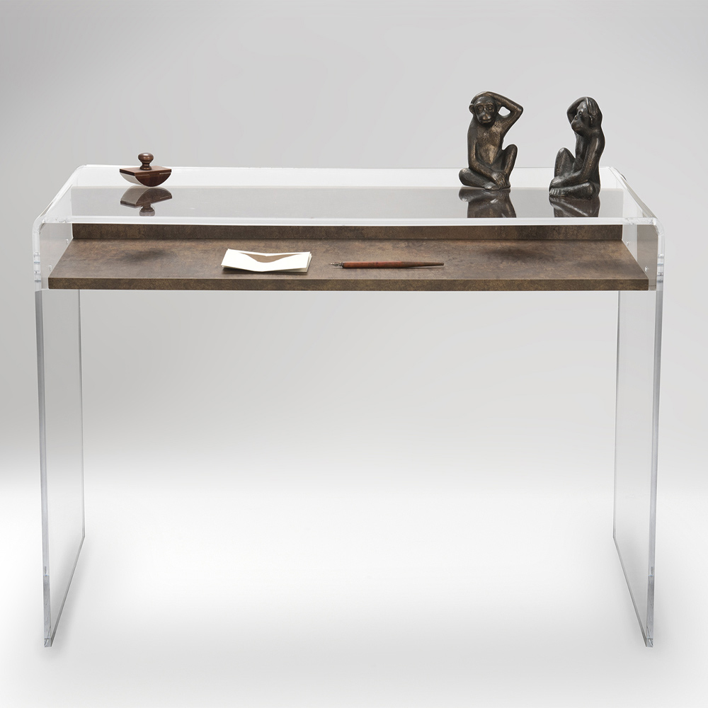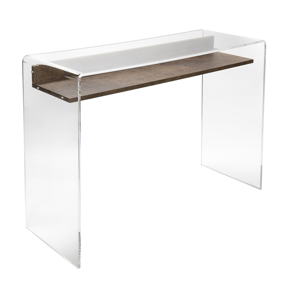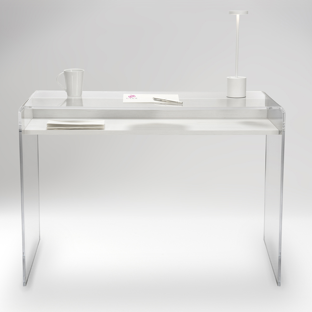 This desk with a practical design is made of 100% PMMA plexiglassfrom transparent virgin polymer and is enriched by a shelf in refined ennobled wood essence.