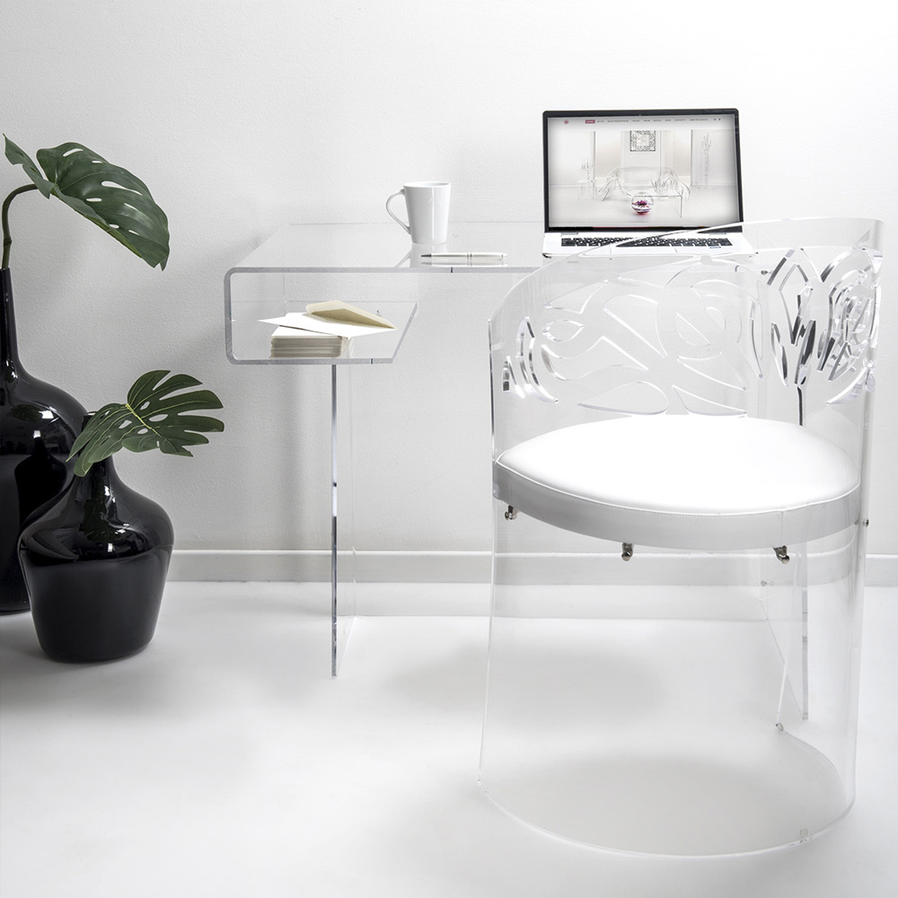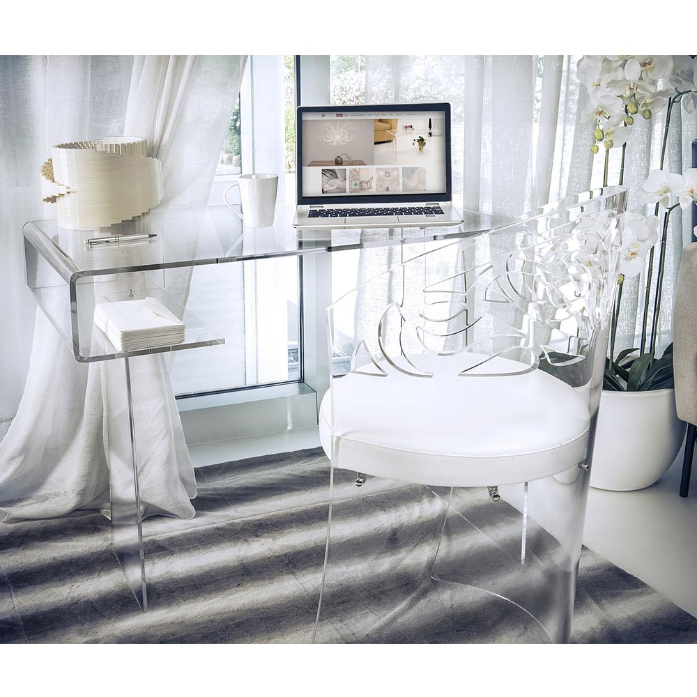 Desk with a practical design made entirely of PMMA plexiglass100% from virgin polymer in clear finish. This piece of furniture has been designed for those who need a simple and essential support surface for studying or working from home; it acts at the same time as a modern , simple and highly functional piece of furniture capable of enriching the surrounding furniture with personality and taste .
