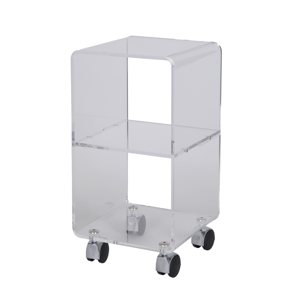 This trolley for the living room with a freestanding column design is entirely made of transparent acrylic glass with a thickness of 8 mm with 1 or 3 shelves and swiveling wheels. Besides being a complemento elegant and functional furniture it is also an object of extremely versatile and space-saving design. The acrylic crystal is the methacrylate polymer that is characterized by the purity of its transparency that surpasses natural crystal.