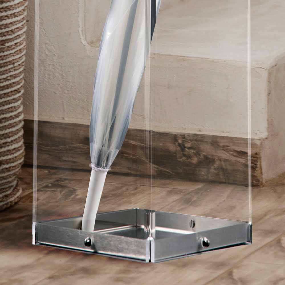 The umbrella stand in transparent plexiglass is characterized by its minimal and completely smooth design, without frills or decorations, to highlight the pure and simple lines with a stainless steel base.