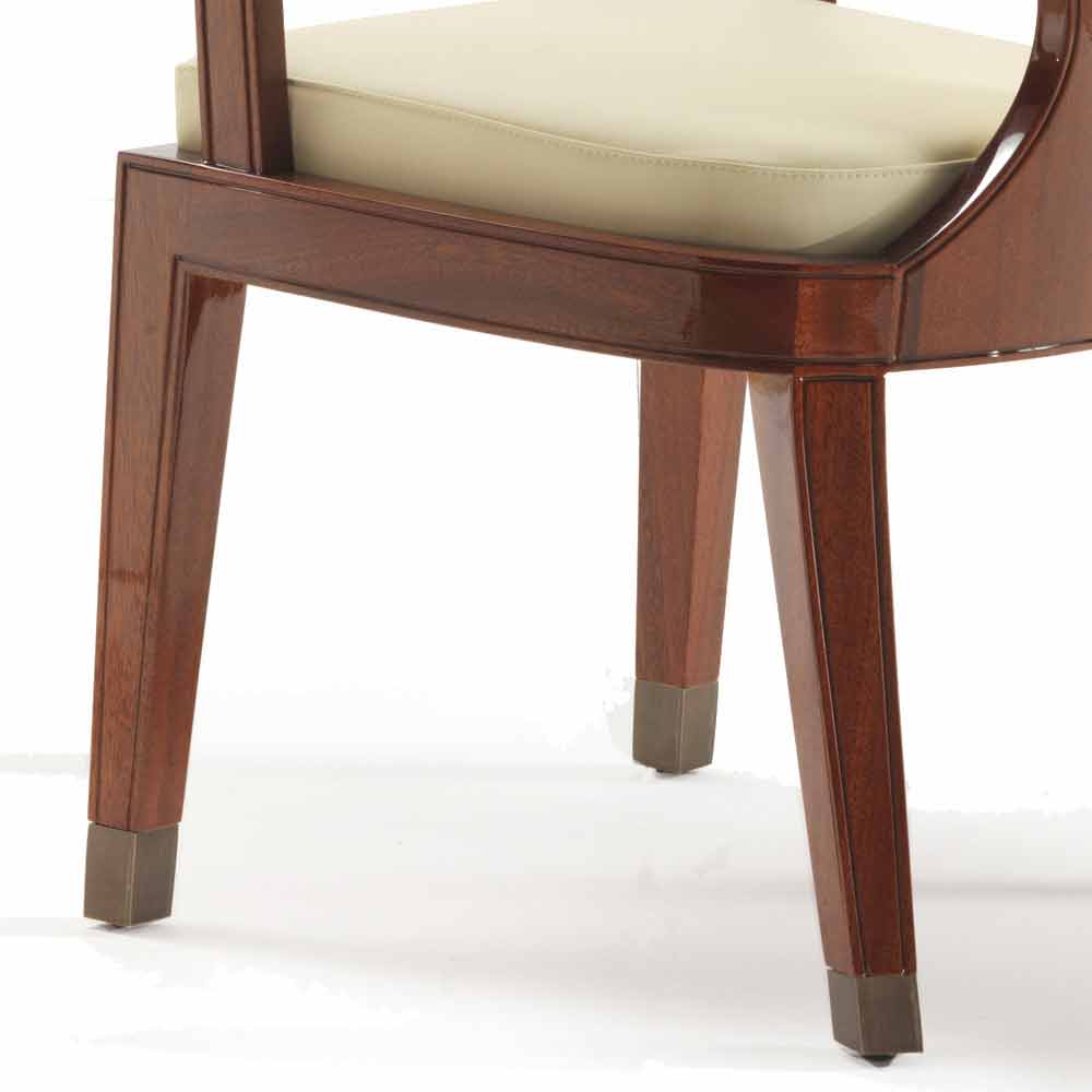 Design upholstered dining chair in smooth wood, L51xP53cm, Nicole Nicole is a kitchen / dining room chair characterized by a design played on the contrast between elements in classic style, such as the decoration of the backrest and more contemporary details such as the shape of the rear legs. The front of the back is in smooth wood, while the back is in worked wood. The seat is padded and covered in leather, the tips are in bronzed brass. Finish in polished mahogany.