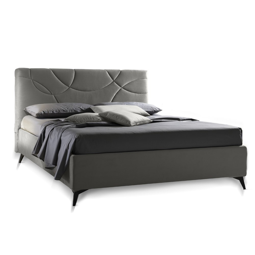 Double bed entirely made in Italy with completely removable upholstered bed frame and headboard covered in fabric or velvet, 160x190 cm orthopedic base and moka finish metal feet (h. 13.5 cm). A furnishing solution that responds to every need by offering maximum comfort together with an essential and elegant design .